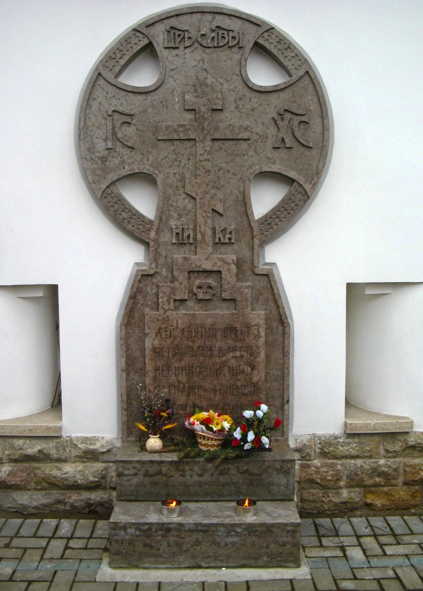 Основание креста представляет собой каменный постамент, на котором установлена плита с высеченным изображением Адамовой главы (черепа с костями). Этот образ отсылает к легенде о том, что крест Христов был установлен на горе Голгофе, что означает «лобное место», где, по преданию, был погребён прах Адама. Кровь Спасителя, омывшая череп первого человека, символически искупила первородный грех.