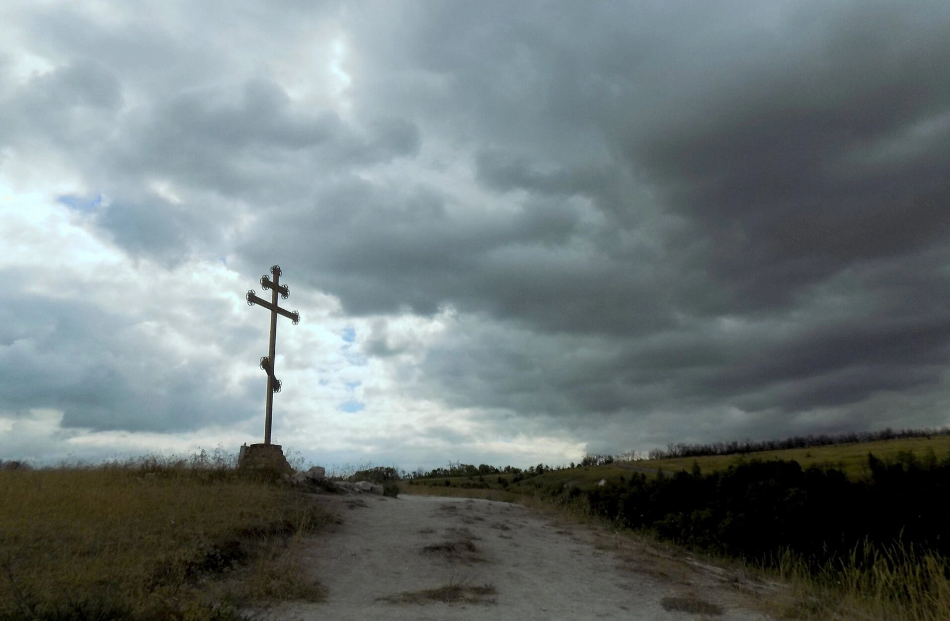 На фотографии запечатлён поклонный крест, воздвигнутый на одном из меловых холмов в окрестностях Свято-Успенского Дивногорского мужского монастыря. Сей священный символ возвышается над окружающей его степной местностью, устремляясь в пасмурное небо, что придаёт образу величие и духовную строгость.