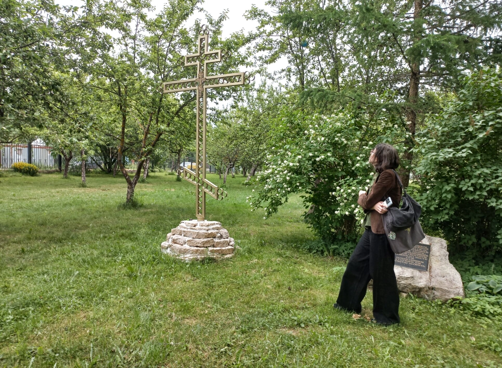 Крест осеняет собой ухоженный зелёный газон, окружённый плодовыми деревьями и декоративными кустарниками. В период цветения, который, вероятно, и запечатлён на снимке, кусты покрываются множеством белых цветов, создавая атмосферу благодати и умиротворения. Этот живописный сад является неотъемлемой частью церковного ансамбля, местом для молитвенного уединения и тихого созерцания.