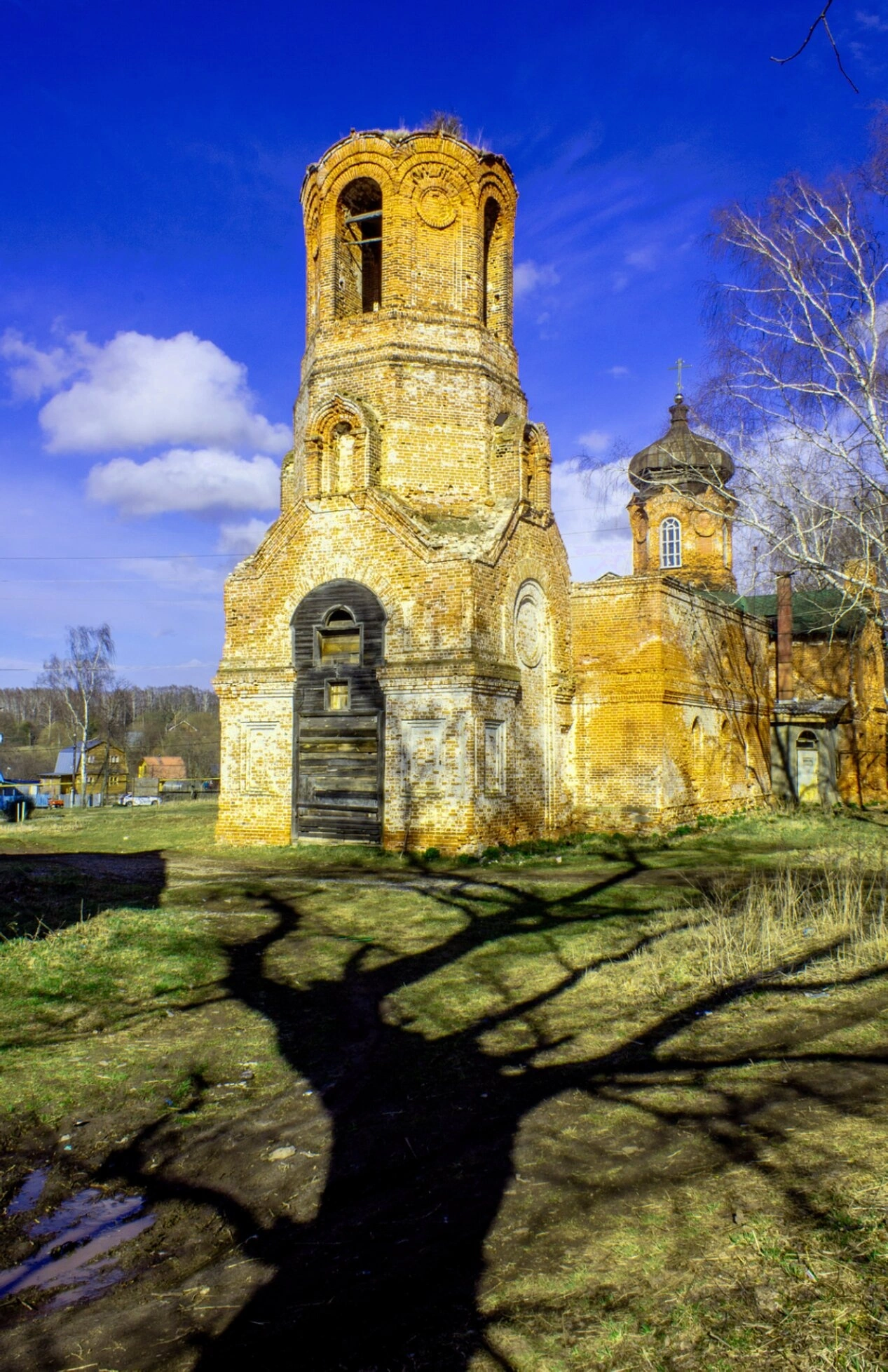 Храм располагается в умиротворённой сельской местности, окружённый пышной зеленью. На переднем плане видны травянистые растения и кустарники, а по сторонам кадра церковь обрамляют высокие деревья, создающие естественное обрамление для святыни. Справа от здания проходит грунтовая дорога, уводящая взгляд вглубь пейзажа. Снимок сделан в ясный день: яркое солнце освещает фасад, подчёркивая фактуру кирпича и объём архитектурных форм, а чистое голубое небо служит величественным фоном, усиливая ощущение благодати и спокойствия.