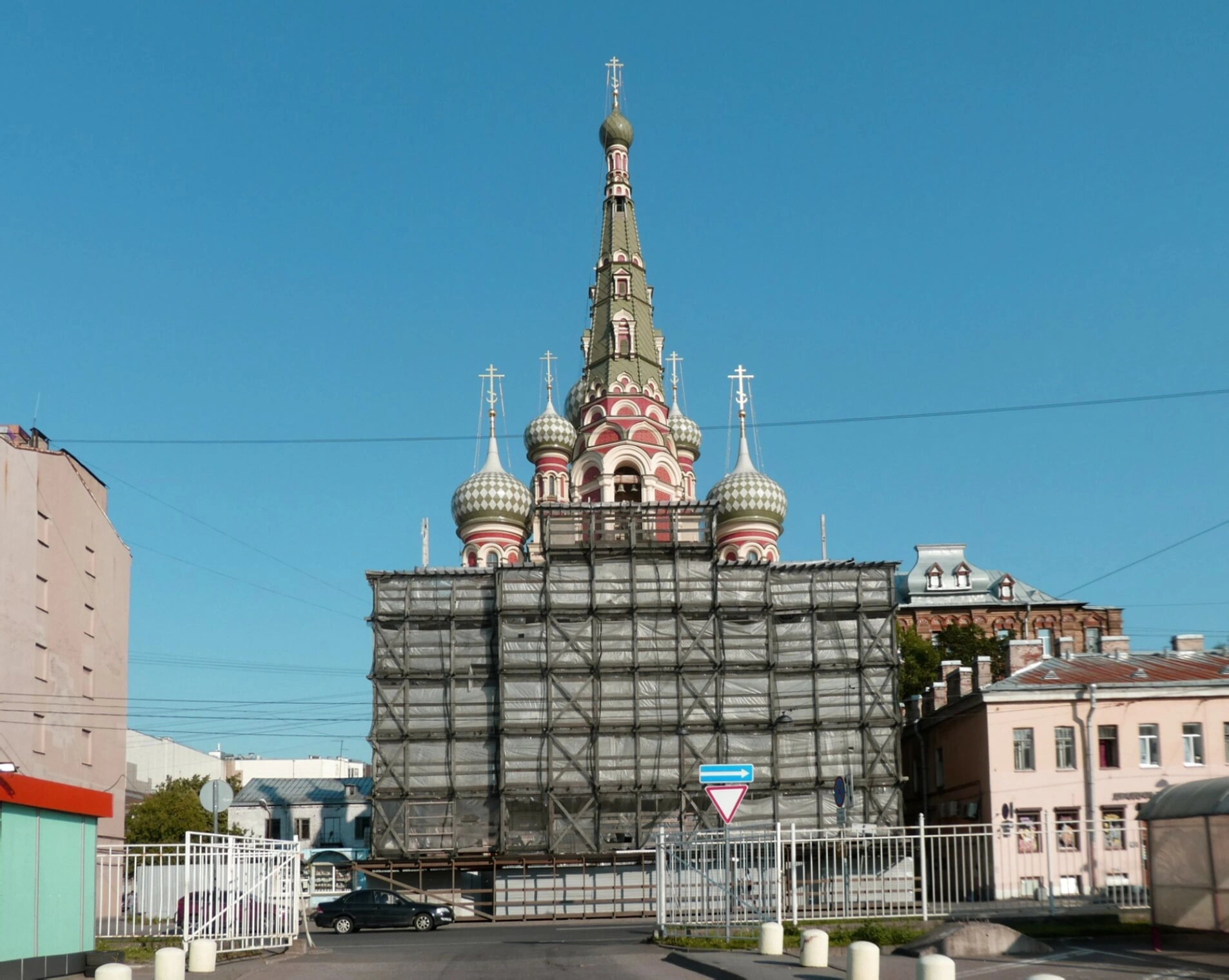 На представленной фотографии запечатлена Церковь Покрова Пресвятой Богородицы, что на Боровой улице в Санкт-Петербурге, в момент проведения масштабных реставрационных работ. Храм, чьи купола частично скрыты строительными лесами, предстаёт в ожидании своего обновления, символизируя непрерывность духовной жизни и заботу о сохранении православного наследия.