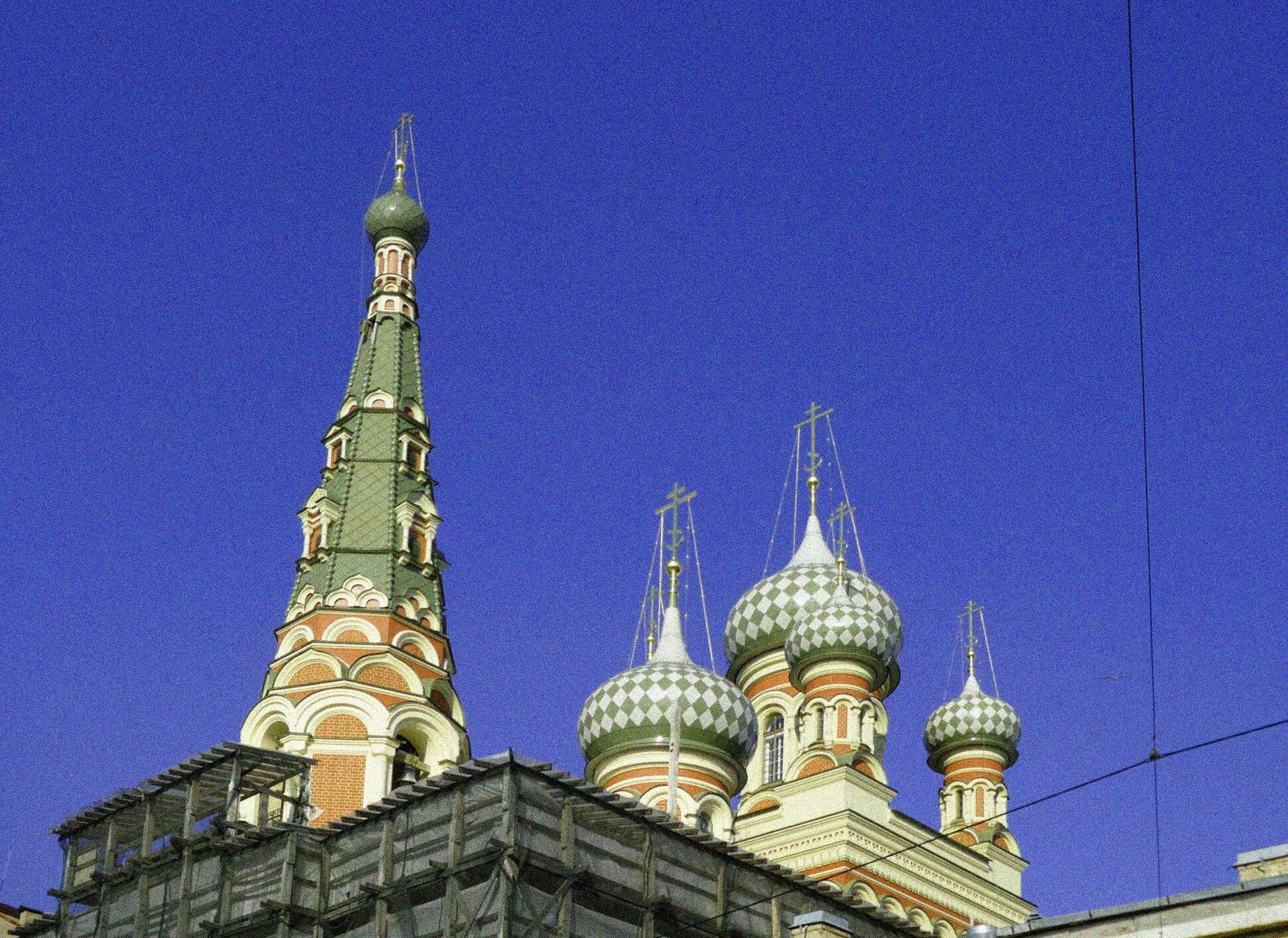 Несмотря на ведущиеся работы, взору открываются прекрасные завершения храма: устремлённые ввысь золочёные купола, увенчанные православными крестами, и изящный шпиль. Декоративное убранство верхних частей церкви, характерное для русского церковного зодчества, украшено росписями и архитектурными элементами, которые продолжают сиять даже под северным небом. В день съёмки небо над городом ясное и синее, что добавляет светлоты и торжественности всему облику.
