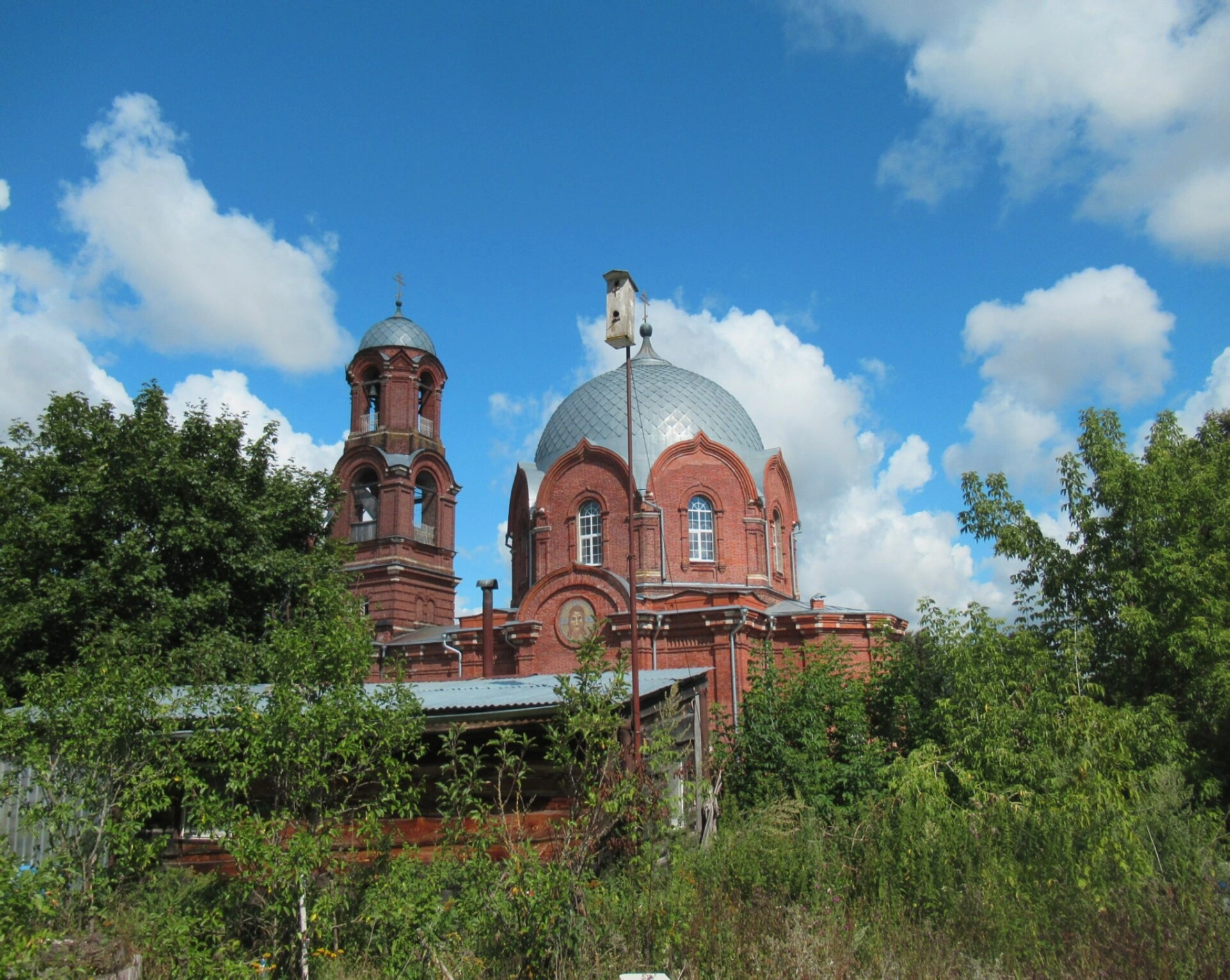 На снимке храм предстаёт в ясный солнечный день. Его краснокирпичные стены с белыми декоративными элементами контрастируют с яркой лазурью неба и густой зеленью окружающих деревьев. Серый луковичный купол главного объёма и синяя глава колокольни гордо возносятся над кронами, а на главке установлен традический православный крест. Фотография передаёт атмосферу благодатного покоя и величия этой намоленной святыни, вновь являющейся домом молитвы для жителей села Сосновка и всех православных христиан.
