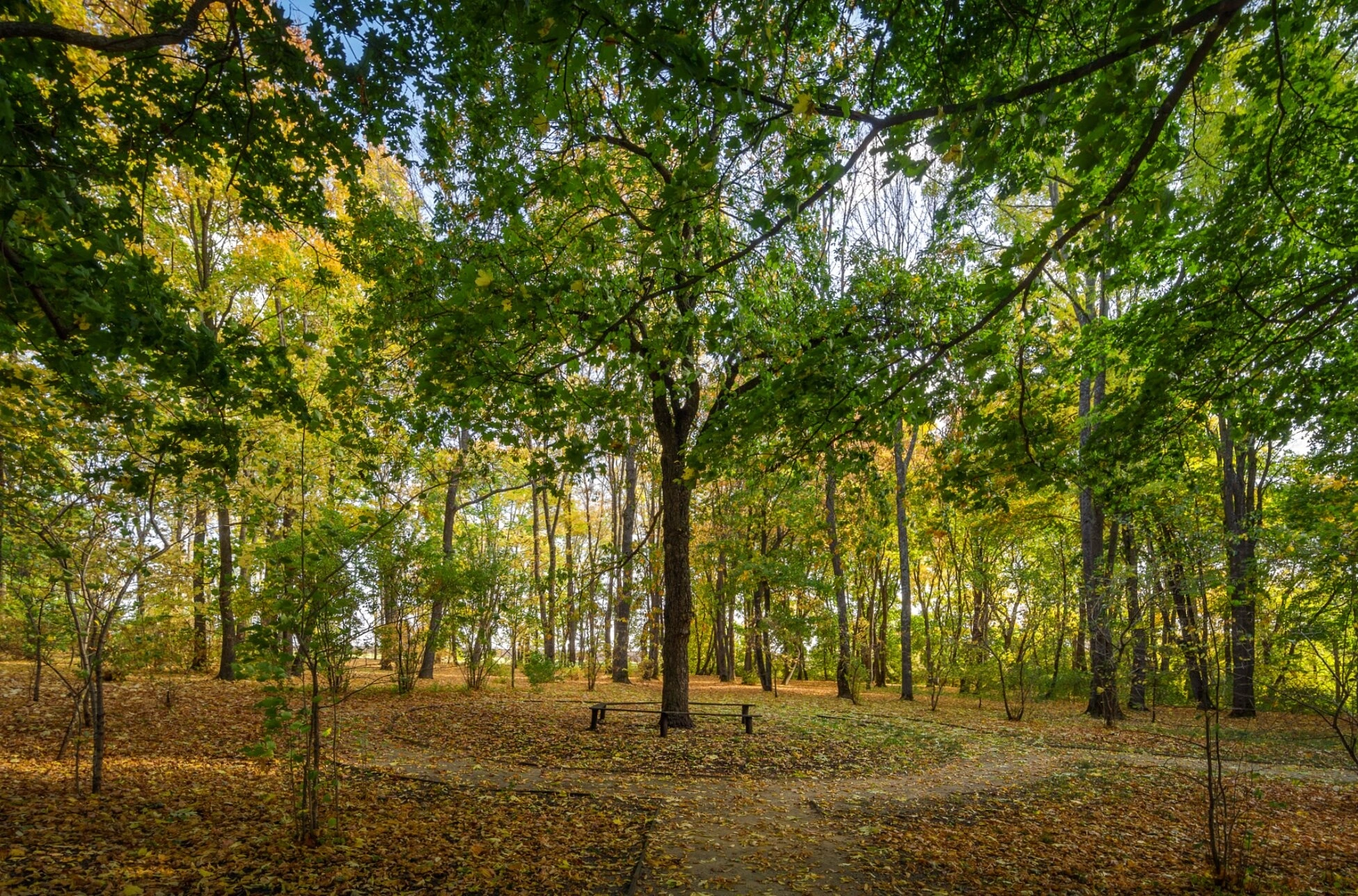 От древнего дерева расходятся две тропинки, устланные ковром из опавших листьев. Осенняя палитра окружающего пейзажа демонстрирует разнообразие оттенков — от насыщенной зелени до золотисто-желтых и огненно-оранжевых тонов, что создает особую атмосферу умиротворения и духовного созерцания. Подобные виды характерны для храмовых комплексов, где природное окружение гармонично сочетается с сакральным пространством.