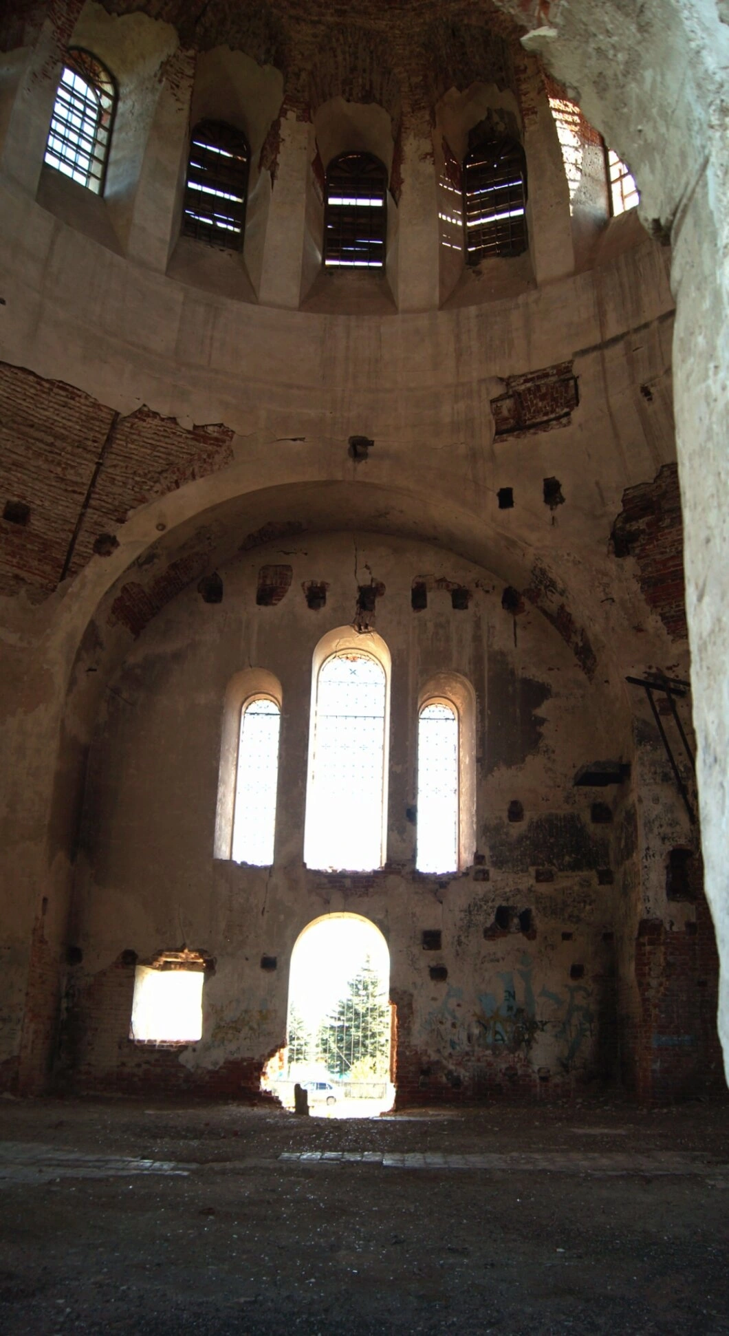 Ныне внутреннее убранство храма пребывает в запустении, однако даже в современном состоянии просматриваются черты былого благолепия. На фотографии видны элементы церковного интерьера, сохранившие память о совершавшихся здесь богослужениях. Стены, некогда украшенные священными изображениями, и пространство, где располагался иконостас, напоминают о предназначении этого места для молитвенного общения с Богом.