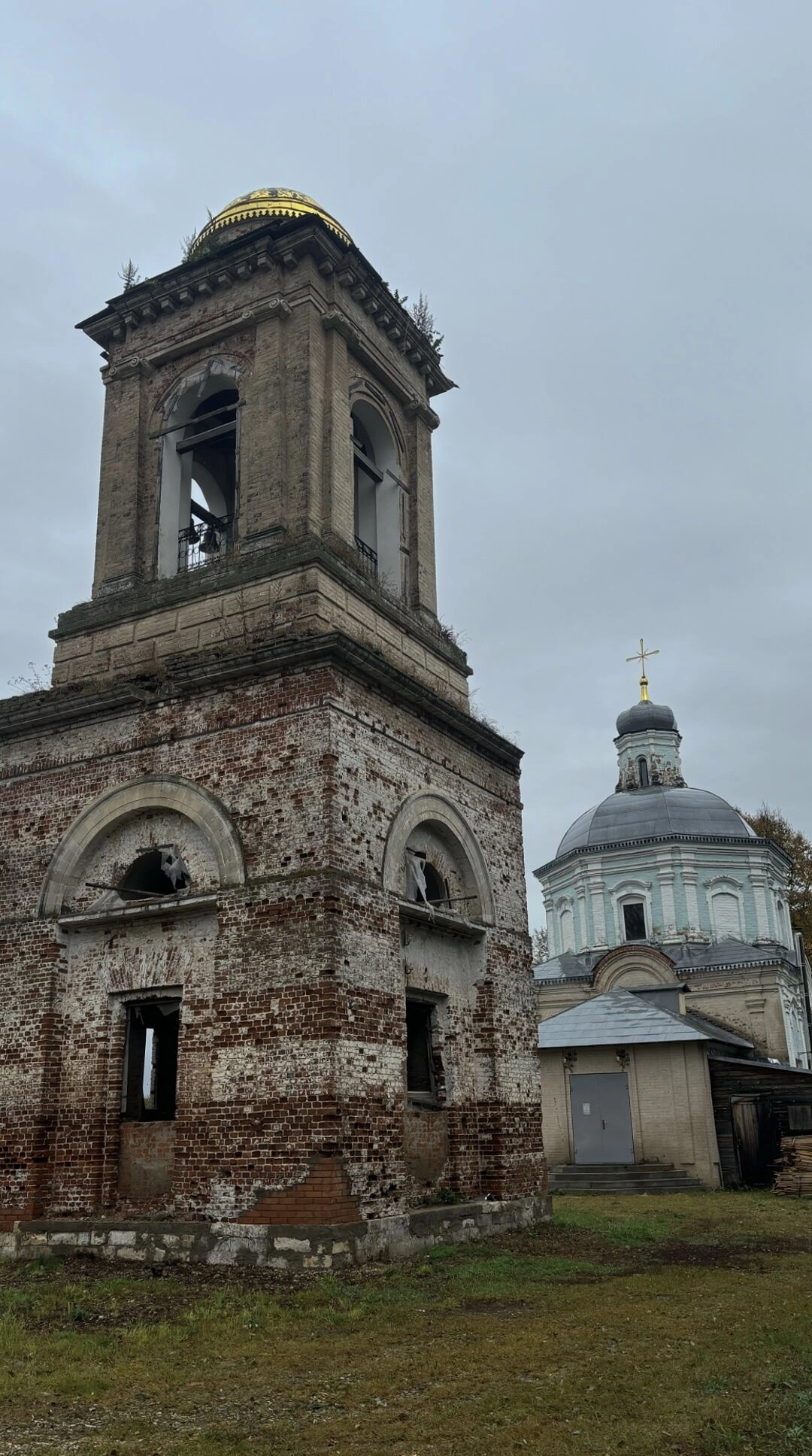 Главный храм, увенчанный синим куполом с установленным православным крестом, предстаёт в относительно сохранном состоянии. Рядом с основным объёмом церкви видна более поздняя пристройка. Вторым доминантным элементом ансамбля является высокая кирпичная колокольня, состоящая из нескольких ярусов. Её верхний ярус находится в заброшенном состоянии, однако завершающий купол, окрашенный в золотой цвет, сохранился.