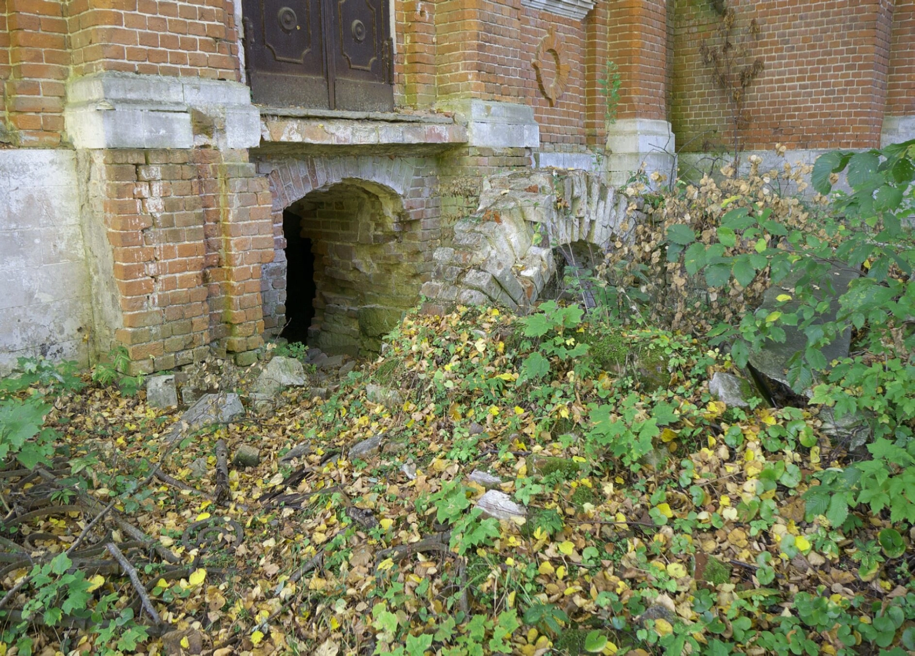 На представленной фотографии запечатлена стена старинного православного храма в честь Покрова Пресвятой Богородицы, расположенного в селе Мышенское Ступинского района Московской области. Здание, возведённое из красного кирпича, ныне пребывает в скорбном состоянии запустения и разрушения, являясь безмолвным свидетелем ушедшей эпохи.