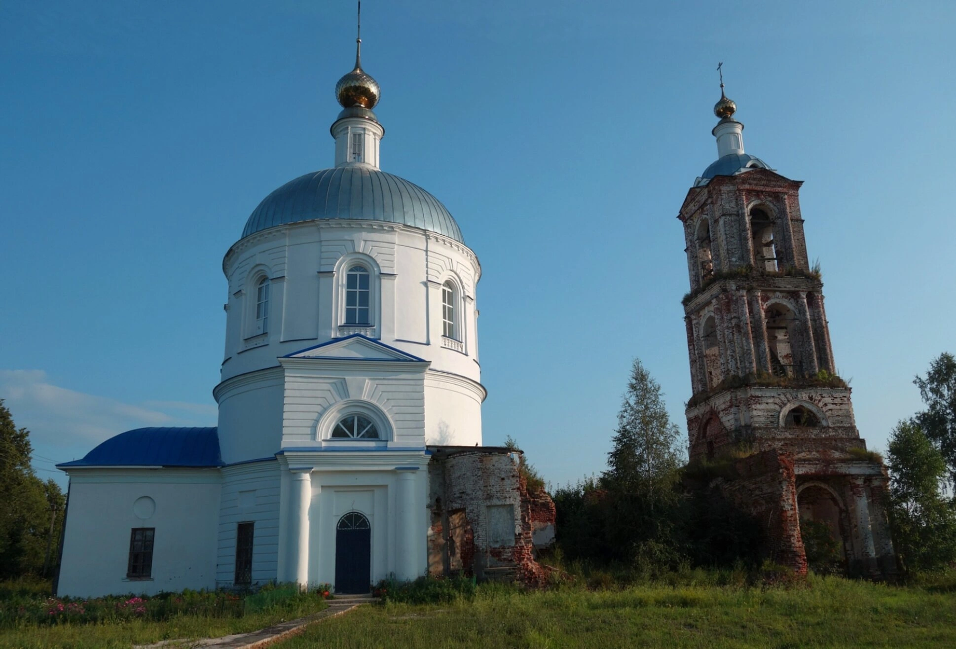 На представленной фотографии запечатлён храмовый ансамбль в честь Покрова Пресвятой Богородицы, расположенный в старинном селе Яковцево Вачского района Нижегородской области. Снимок являет взору благоговейную картину: на фоне чистого неба и щедрой зелени возвышаются два строения, повествующие о разных эпохах и судьбах.