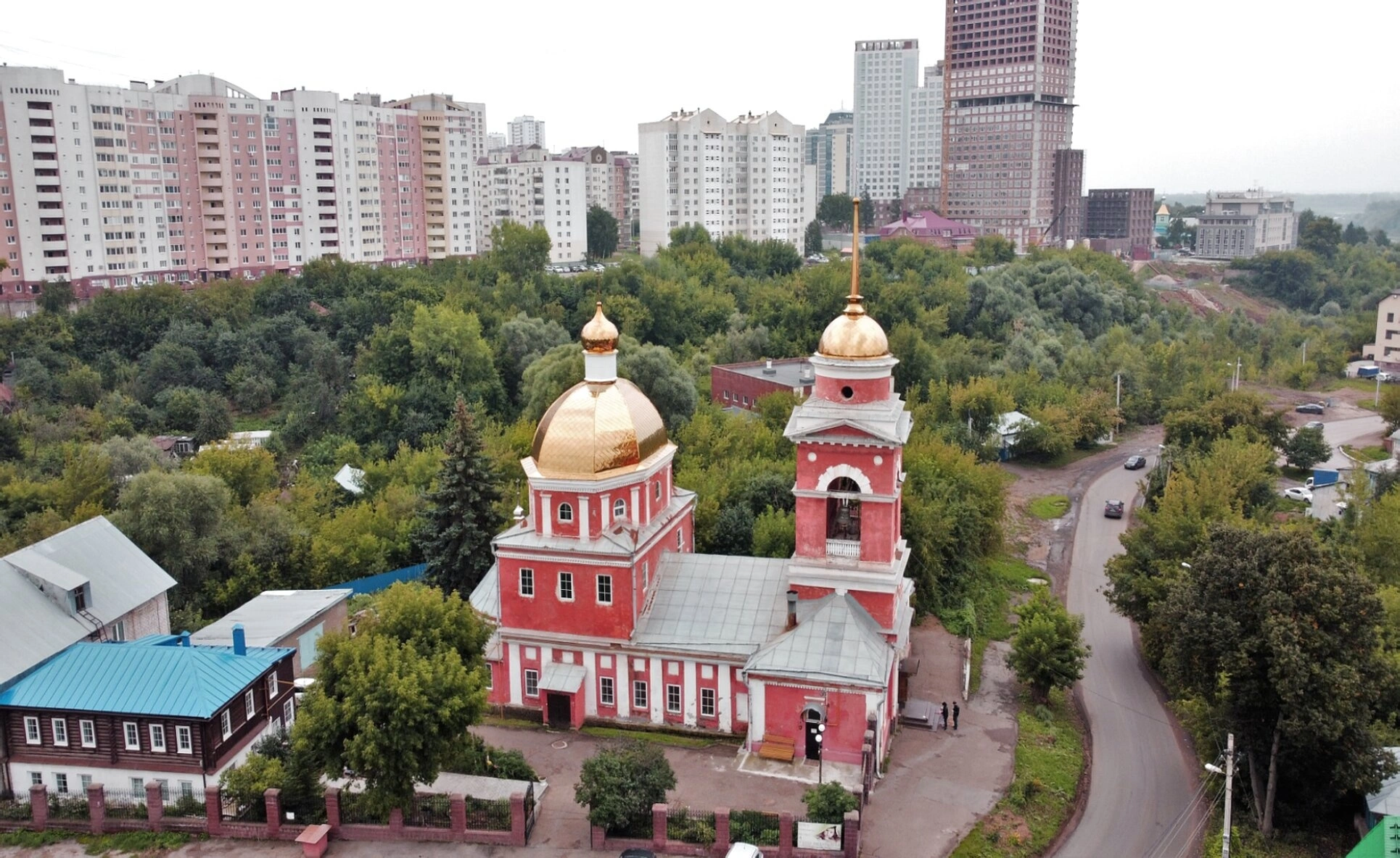Окружает дом Божий ухоженная зелёная территория, что создаёт ощущение уюта и благодати. Особый интерес на фотографии представляет контраст между древней святыней и современным городским пейзажем, виднеющимся на заднем плане. Этот вид подчёркивает, что храм, несмотря на течение времени и изменение облика города, остаётся незыблемым духовным центром и оплотом православия для жителей Уфы.