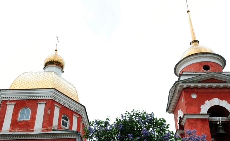 В архитектурном облике храма, запечатленного на снимке, прослеживаются характерные для русского классицизма черты: симметричная композиция, строгие пропорции и сдержанный декор. Колокольня, устроенная на средства князя Уракова, органично вписана в общую структуру здания. В промежутке между куполами храма и колокольни виднеется цветущая сирень, что придает кадру особое лирическое настроение и подчеркивает умиротворенную атмосферу этого святого места.