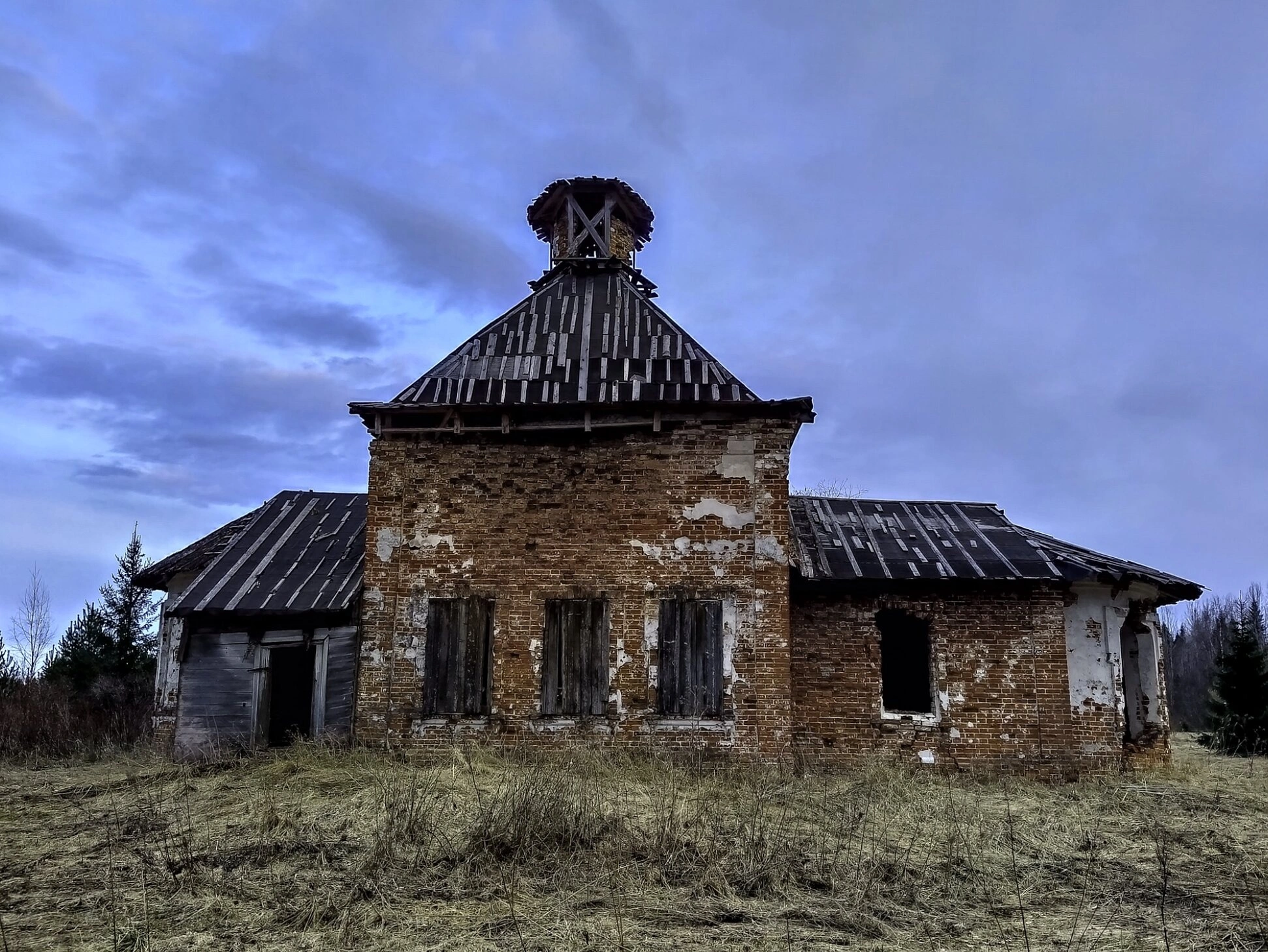 Храм расположен на возвышенности, что традиционно для православного церковного строительства, символизируя стремление к горнему миру. Окружающий пейзаж с пожухлой травой и редкими деревьями подчёркивает уединённость и заброшенность этого некогда духовного центра. Пасмурное небо, запечатлённое на снимке, добавляет композиции особую меланхоличную атмосферу, напоминая о быстротечности земного бытия и необходимости сохранения памятников духовного наследия.