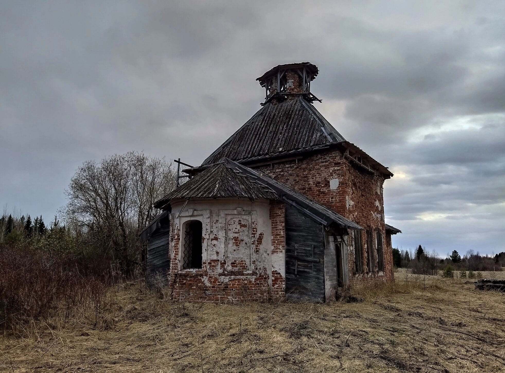 Здание церкви выполнено из кирпича и увенчано деревянным шатровым завершением, характерным для традиционного северного зодчества. На снимке хорошо видны следы многолетнего запустения: обвалившаяся штукатурка, разрушенные оконные проемы и потемневший от времени деревянный сруб. Эти повреждения свидетельствуют о длительном периоде neglect храма, который некогда был духовным центром для местных жителей.