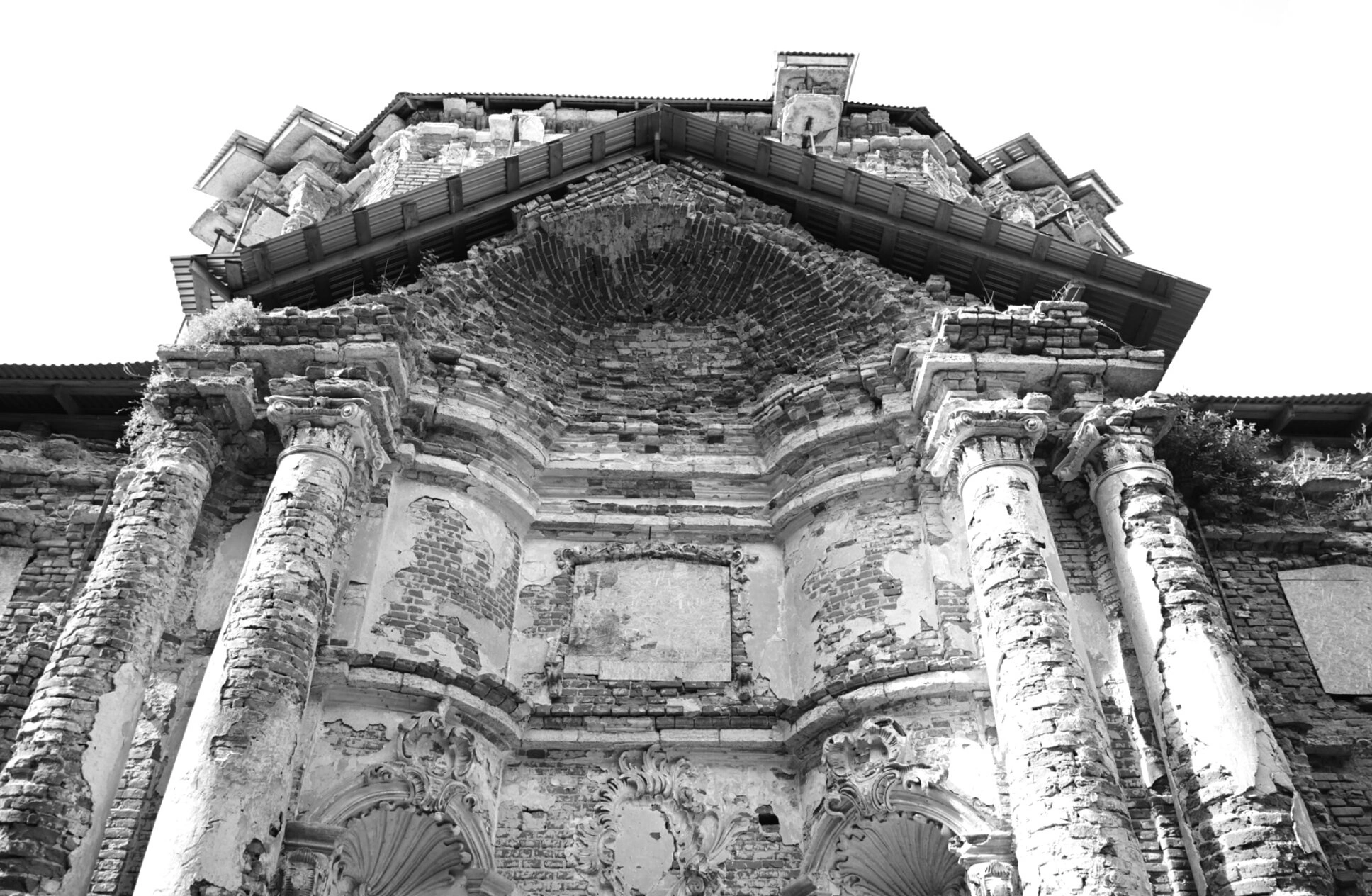 Церковь представляет собой редкий образец русского барокко с элементами декора рококо, что необычно для провинциальной храмовой архитектуры. На фотографии видны следы разрушительного воздействия времени: обвалившаяся штукатурка, обнажившая кирпичную кладку, утраты декоративных элементов. Несмотря на это, в деталях фасада угадывается былое великолепие - причудливые украшения в виде раковин, древесного орнамента и других сложных архитектурных форм.