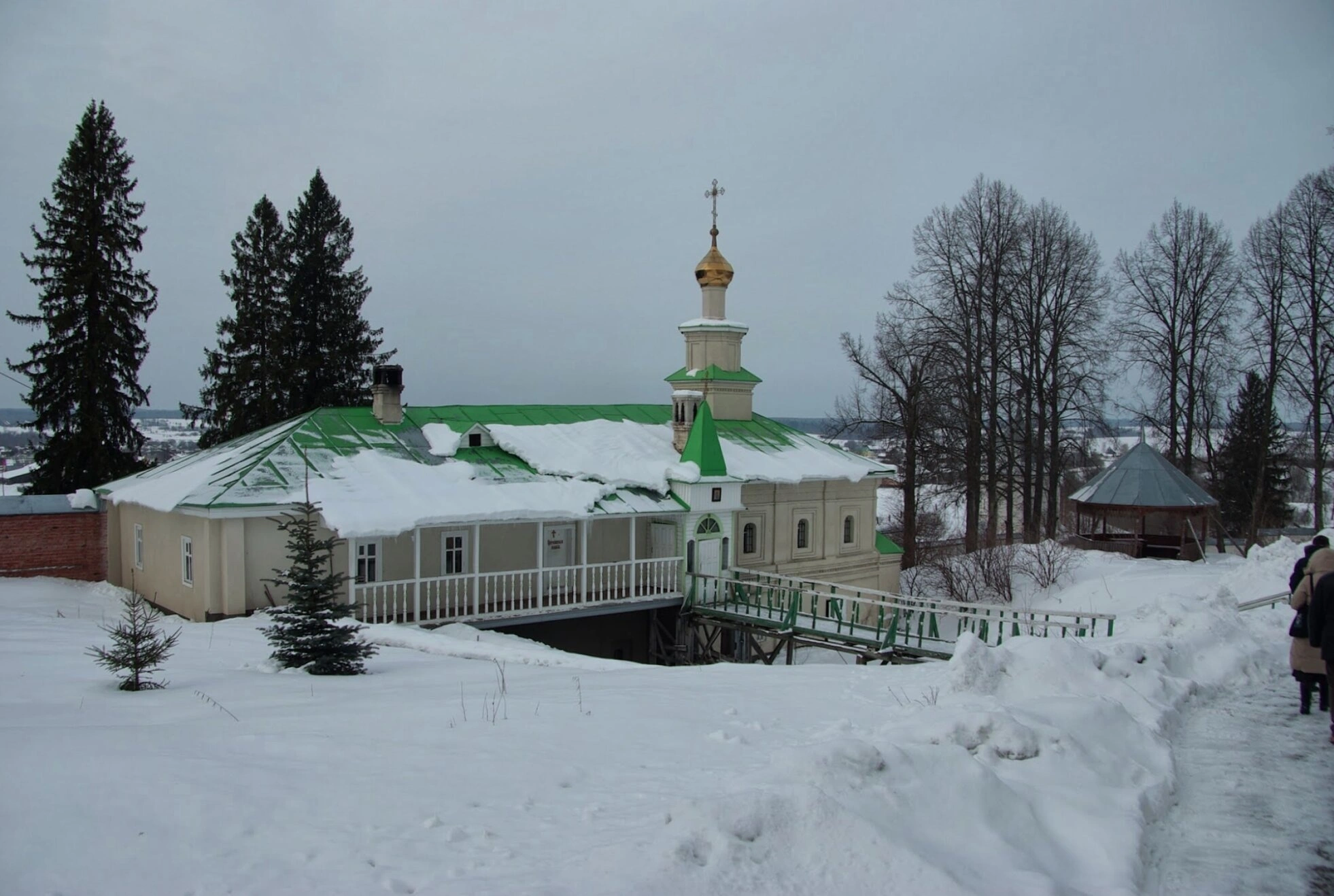 Территория монастыря ухожена, видны деревянные мостки, ведущие к храмам, и вековые ели, охраняющие покой обители. Зимний пейзаж подчеркивает уединенность и особую атмосферу молитвенного сосредоточения, свойственную этому месту.