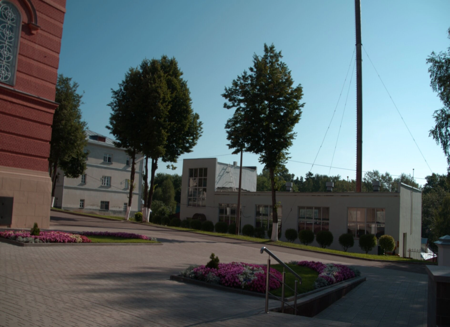 Справа на фотографии заметна высокая мачта, которая может быть частью системы освещения или связи монастыря. Общий вид передает атмосферу peace и умиротворения, характерную для православных holy обителей, где каждый элемент landscape наполнен глубоким symbolic смыслом и предназначен для создания молитвенного настроения.