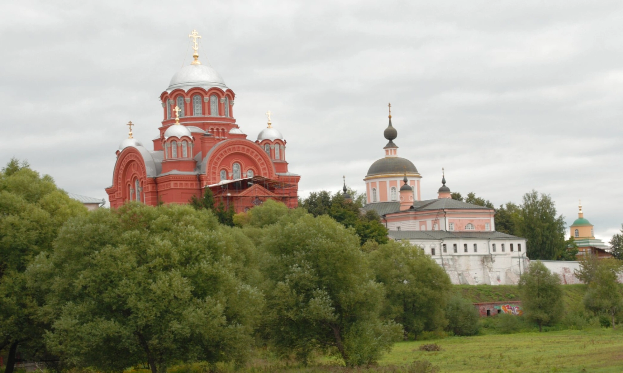 Центральное место на снимке занимает величественный Покровский собор, выстроенный из красного кирпича и увенчанный серебристыми куполами с сияющими на солнце златоглавыми крестами. Справа от собора виднеются другие монастырские строения — храмы и корпуса со светлыми стенами и тёмными кровлями, а также фрагмент монастырской ограды, что вместе образует целостный и гармоничный архитектурный комплекс.