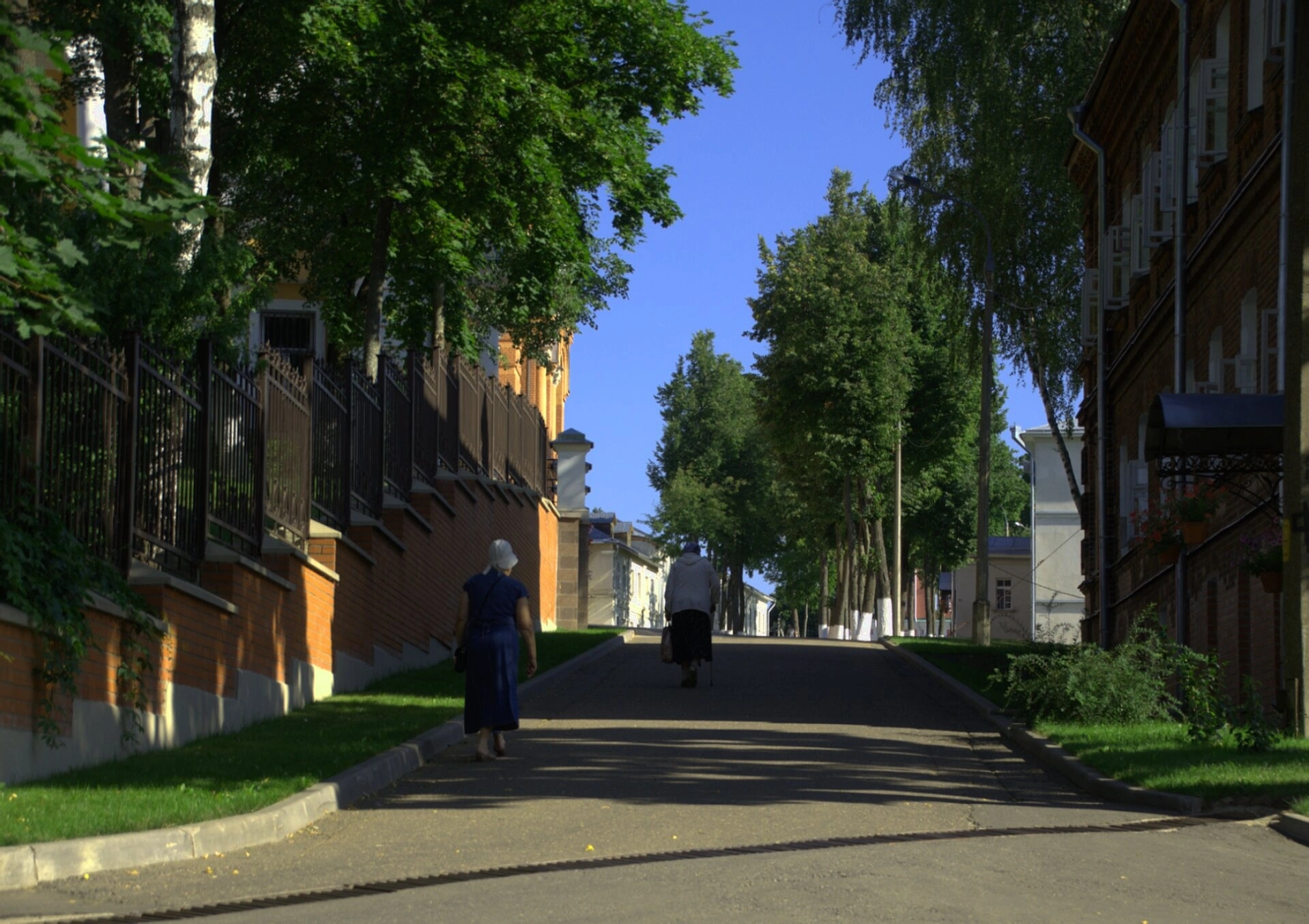 Две благочестивые прихожанки, одетые в скромные одеяния, одна из которых покрыта головным платком, что соответствует традиции, движутся по дороге. Их присутствие оживляет пейзаж и подчёркивает молитвенную атмосферу святого места. Чистота и порядок, наблюдаемые на фотографии, являются отражением заботы сестёр о вверенной им обители. Данный образ передаёт тихую благодать и уединённый дух одной из древнейших православных обителей России, являющейся объектом культурного наследия и важным центром духовной жизни.