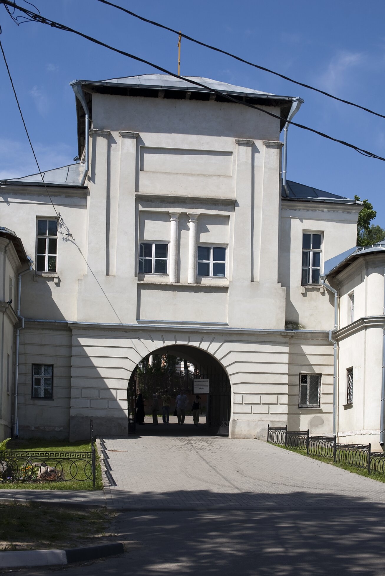 На снимке прекрасно виден архитектурный облик надвратного храма, возведённого в классическом стиле. Белоснежный фасад, увенчанный золочёной главкой с крестом, создаёт ощущение лёгкости и величия. Арочный проезд, служащий главным входом на территорию монастыря, символизирует врата в духовный мир. Сквозь арку открывается вид на ухоженную монастырскую территорию, что придаёт кадру глубину и ощущение причастности.