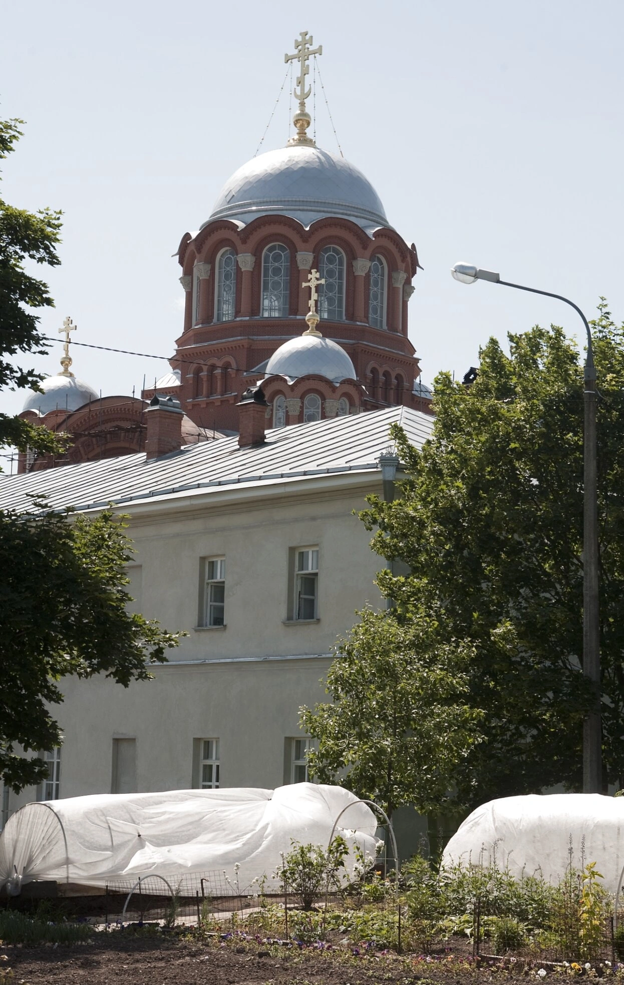 На переднем плане и по сторонам фотографии видны монастырские деревья с густой листвой, что подчёркивает уединённый и молитвенный характер жизни обители. Частично скрытые зеленью хозяйственные постройки, включая теплицы под белым укрывным материалом, свидетельствуют о традиционном монастырском укладе, включающем трудничество и заботу о собственном хозяйстве.