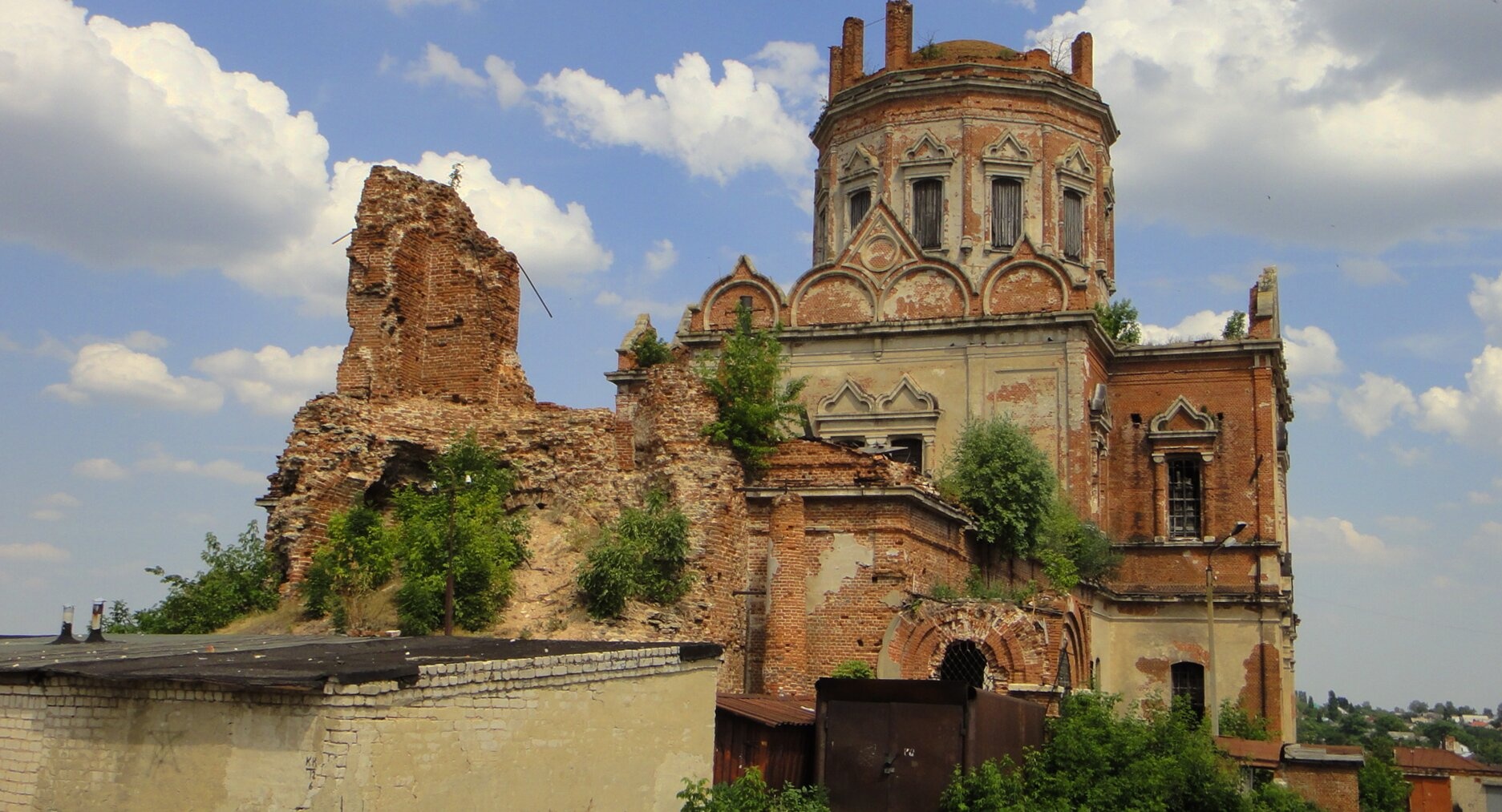 На представленной фотографии запечатлена Церковь Покрова Пресвятой Богородицы, известная также как Покровский храм, расположенная в древнем городе Ельце Липецкой области. Этот памятник православной архитектуры, ныне пребывающий в скорбном состоянии, является немым свидетелем истории и духовной жизни города.