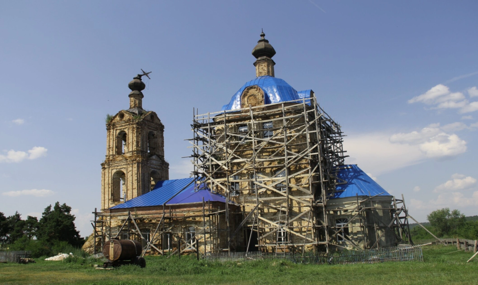 В момент съемки храм находился на этапе масштабных реставрационных работ, что отчетливо видно по строительным лесам, полностью окружающим основное здание. Синие защитные тенты укрывают купола и кровлю от атмосферных воздействий во время проведения восстановительных работ. Отдельно стоящая колокольня, расположенная слева от основного объема храма, также требует внимания реставраторов.