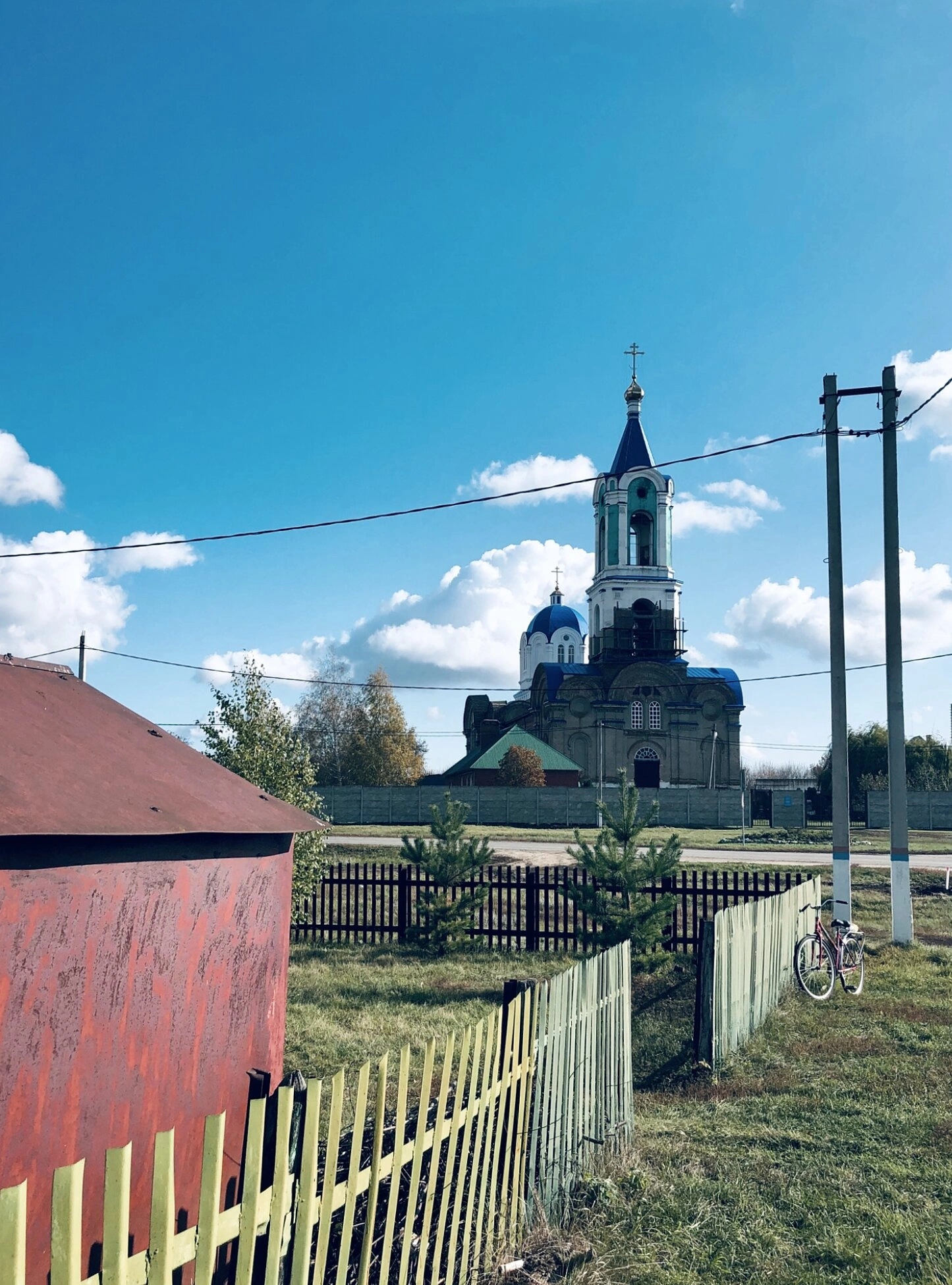 На переднем плане снимка видны детали сельского быта: старый красный сарай, светло-зелёный деревянный забор, высокая трава и розовый велосипед, прислонённый к ограде. Два деревянных столба электропередач напоминают о современной инфраструктуре. За вторым, тёмно-коричневым забором начинается средний план, где растут небольшие хвойные и лиственные деревья с осенней листвой. Эта простая, будничная обстановка подчёркивает величие главного объекта фотографии.