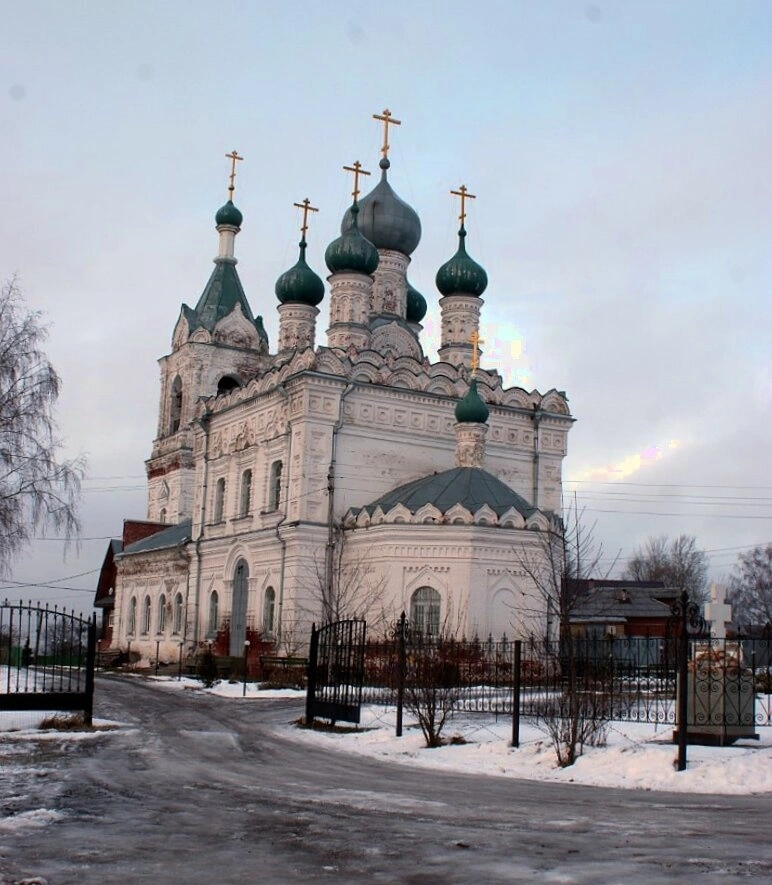 На снимке запечатлён внешний облик храма в один из дней межсезонья. Дорога, ведущая к церковной ограде, покрыта талым снегом, а деревья стоят без листьев. Белокаменные стены, тёмные купола, увенчанные крестами, и высокая шатровая колокольня создают величественный и строгий образ. Отсутствие людей на переднем плане позволяет вдумчиво рассмотреть архитектурные детали и почувствовать благоговейную атмосферу этого намоленного места.