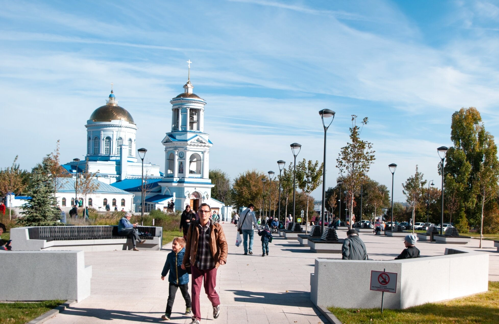 Перед собором простирается благоустроенная территория Советской площади. Аккуратные пешеходные дорожки, зелёные насаждения, скамейки для отдыха и фонари составляют гармоничное пространство, где горожане и паломники могут провести время в тишине и размышлении. На фото видно, что площадь является популярным местом для неспешных прогулок и молитвенного настроя.