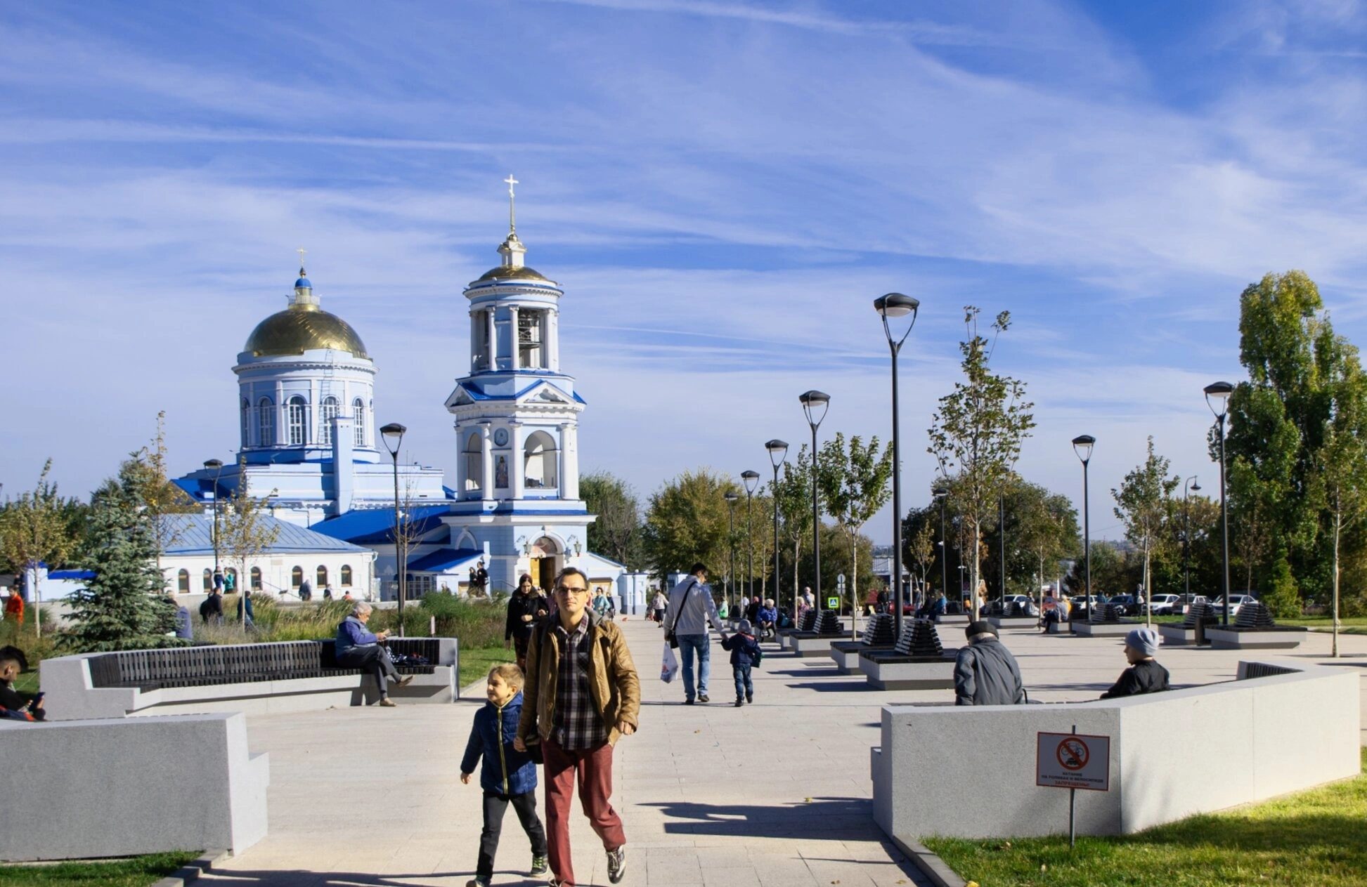 На снимке прекрасно видна архитектурная доминанта площади — белоснежный собор с сияющими на солнце лазурными куполами, увенчанными златоглавыми крестами. Высокая колокольня устремляется ввысь, в ясное голубое небо, символизируя молитвенную связь земного и горнего миров. Святыня представляет собой великолепный образец русского церковного зодчества.