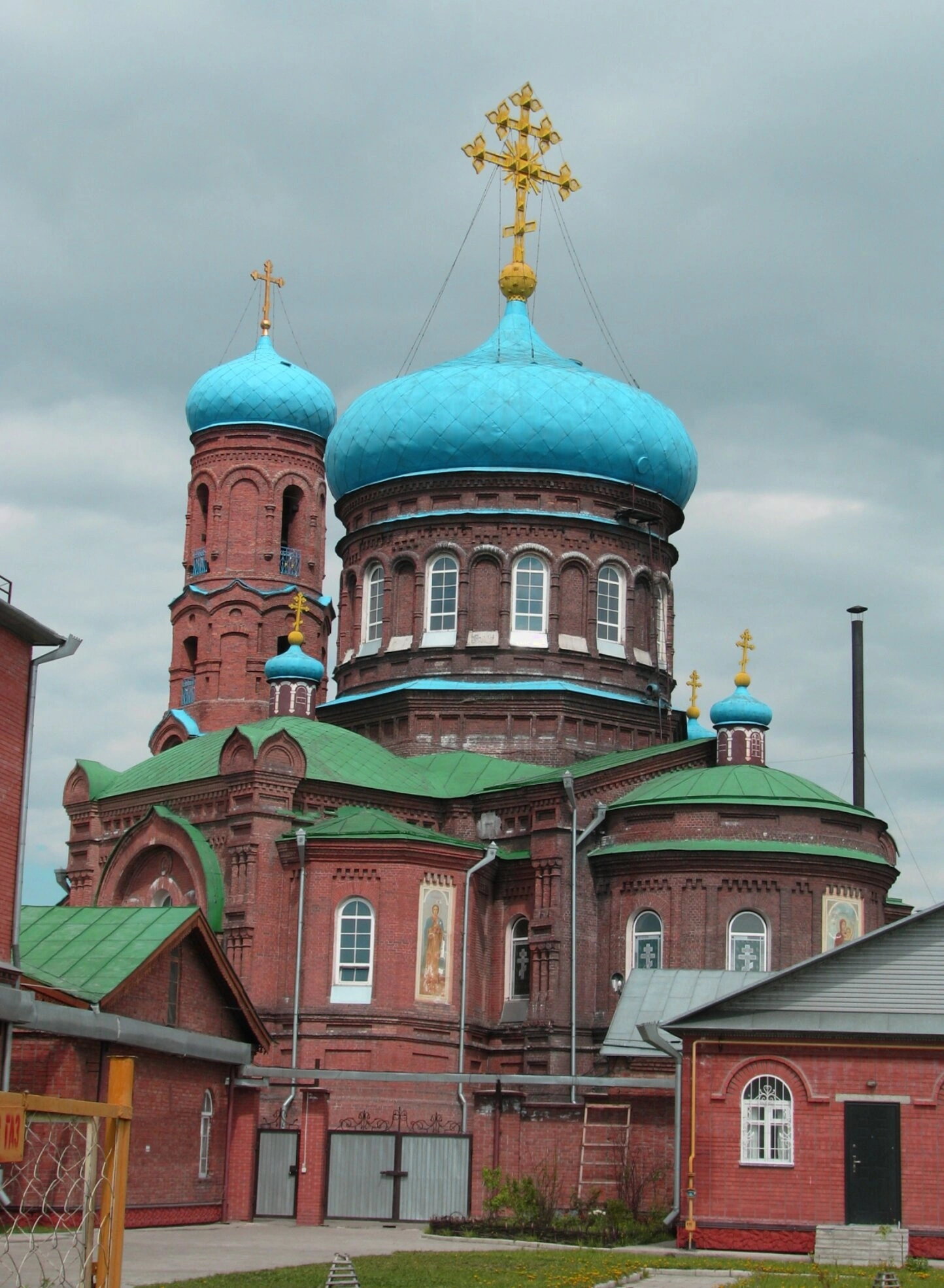 Величественное кирпичное здание собора, выполненное в русско-византийском стиле, поражает своим благолепием. На снимке хорошо видны его характерные синие купола, увенчанные златыми православными крестами, сияющими даже в пасмурный день. Над главным объёмом возвышается мощный световой барабан с центральным куполом, символизирующим Господа Иисуса Христа, в то время как меньшие купола, расположенные над алтарной частью и колокольней, signifyют евангелистов. Фасад храма украшен декоративной кирпичной кладкой и арочными оконными проёмами с белыми наличниками.