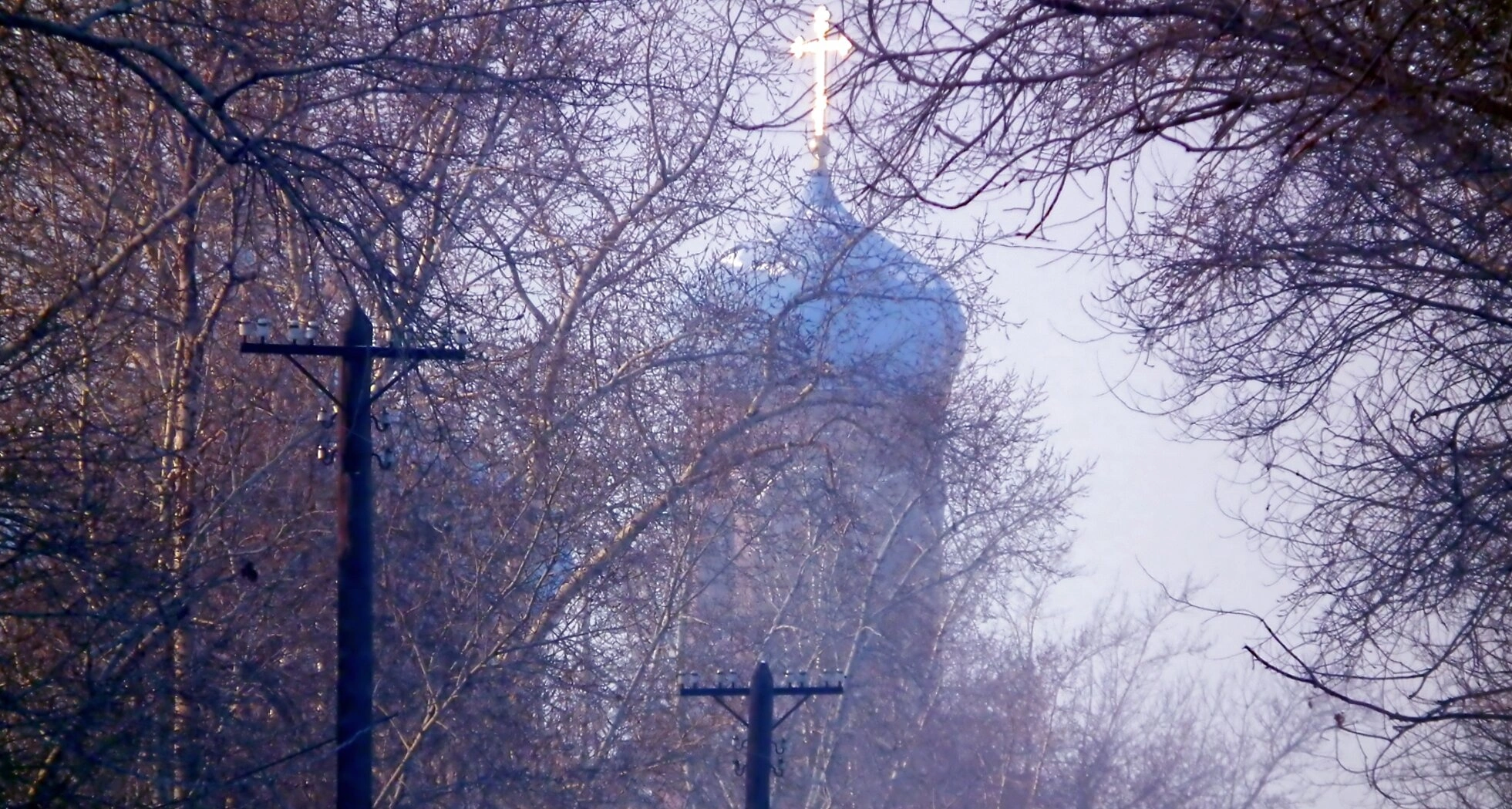 На представленной фотографии запечатлён величественный вид Покровского кафедрального собора, являющегося одной из ключевых православных святынь Барнаула. Через ажурный узор голых ветвей зимнего леса проступает золотой купол храма, увенчанный животворящим крестом, символизирующим победу жизни над смертью. Лучи холодного солнца мягко освещают сияющую главу, создавая ощущение божественного присутствия и благодати.