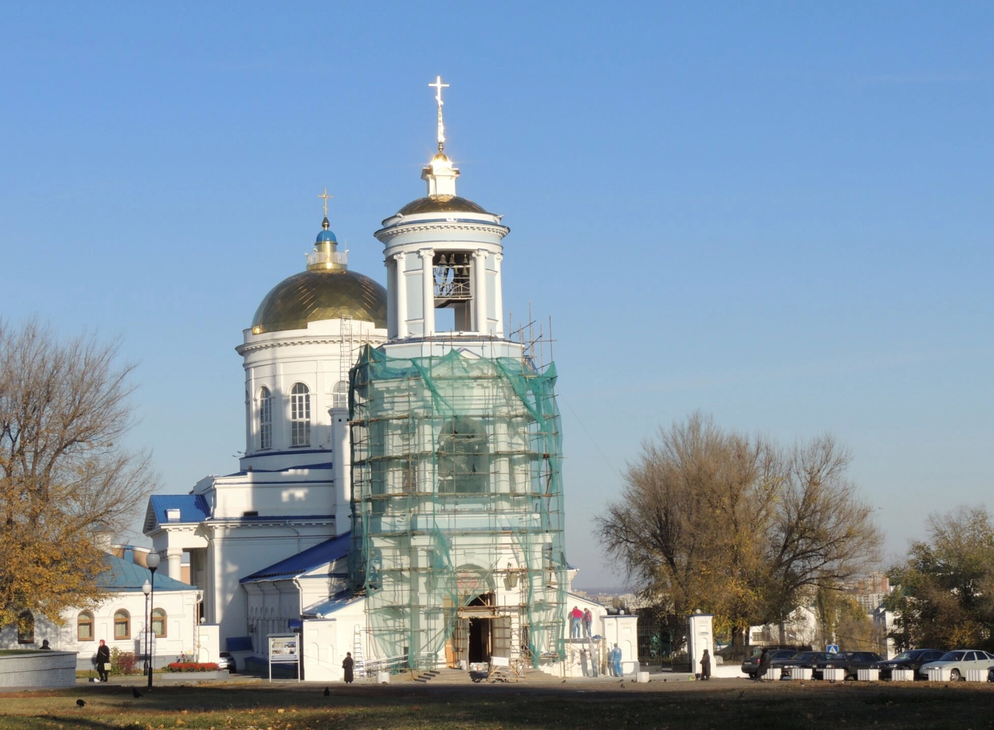 На фотографии можно наблюдать собор в один из осенних дней. Главный объём храма увенчан массивным световым барабаном с золочёной главой и крестом. Фасад отличается строгостью и лаконичностью форм, характерных для классицизма. В момент съёмки колокольня собора, являющаяся важной архитектурной доминантой, покрыта строительными лесами с защитной сеткой, что свидетельствует о проведении реставрационных работ по её сохранению и восстановлению.