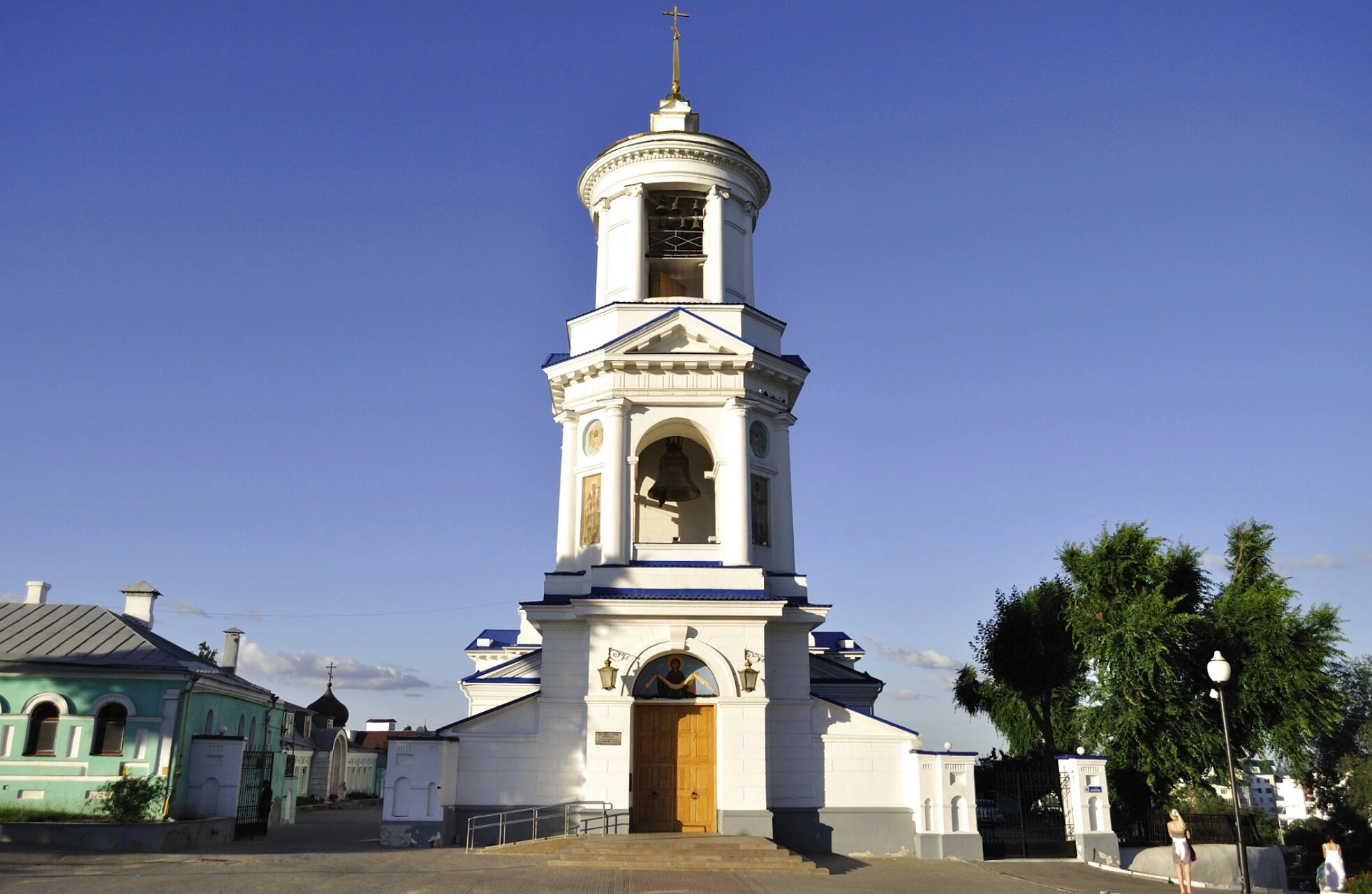 Белоснежное здание собора с сине-голубыми куполами, увенчанными золочёными крестами, эффектно выделяется на фоне ясного неба. Центральным элементом композиции является высокая многоярусная колокольня, в арочных проёмах которой размещены колокола. На вершине колокольни сияет крест, символизирующий победу жизни над смертью. В нижнем ярусе расположен главный вход в храм, обрамлённый деревянными дверями.
