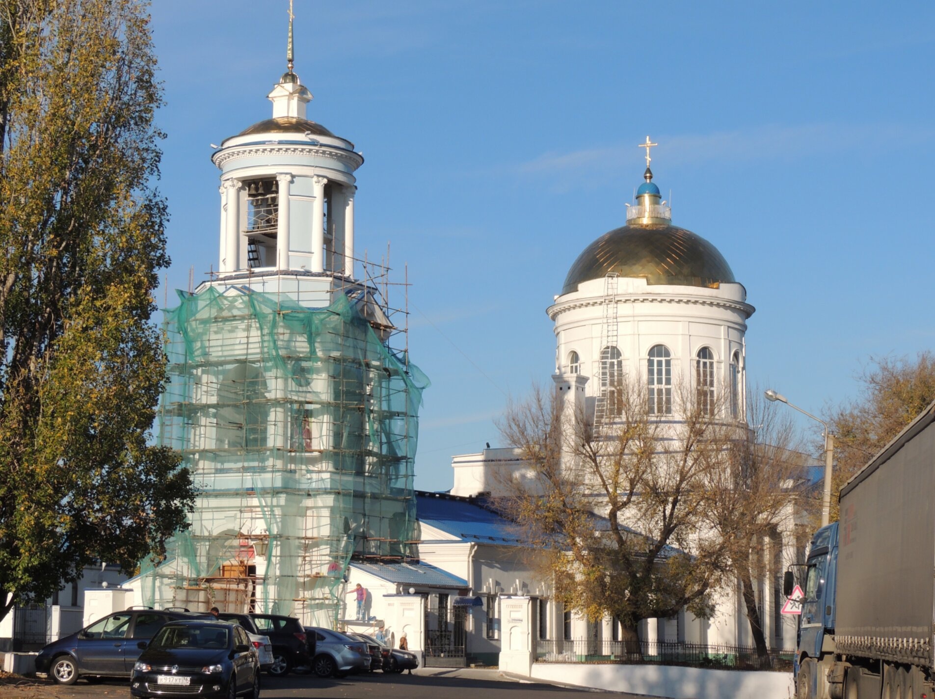 На фотографии запечатлён Покровский кафедральный собор города Воронежа, являющийся главным храмом Воронежской митрополии. Святыня располагается по адресу: улица Бехтерева, дом 36. На снимке собор предстаёт в процессе проведения реставрационных работ, о чём свидетельствуют строительные леса, установленные на его колокольне.