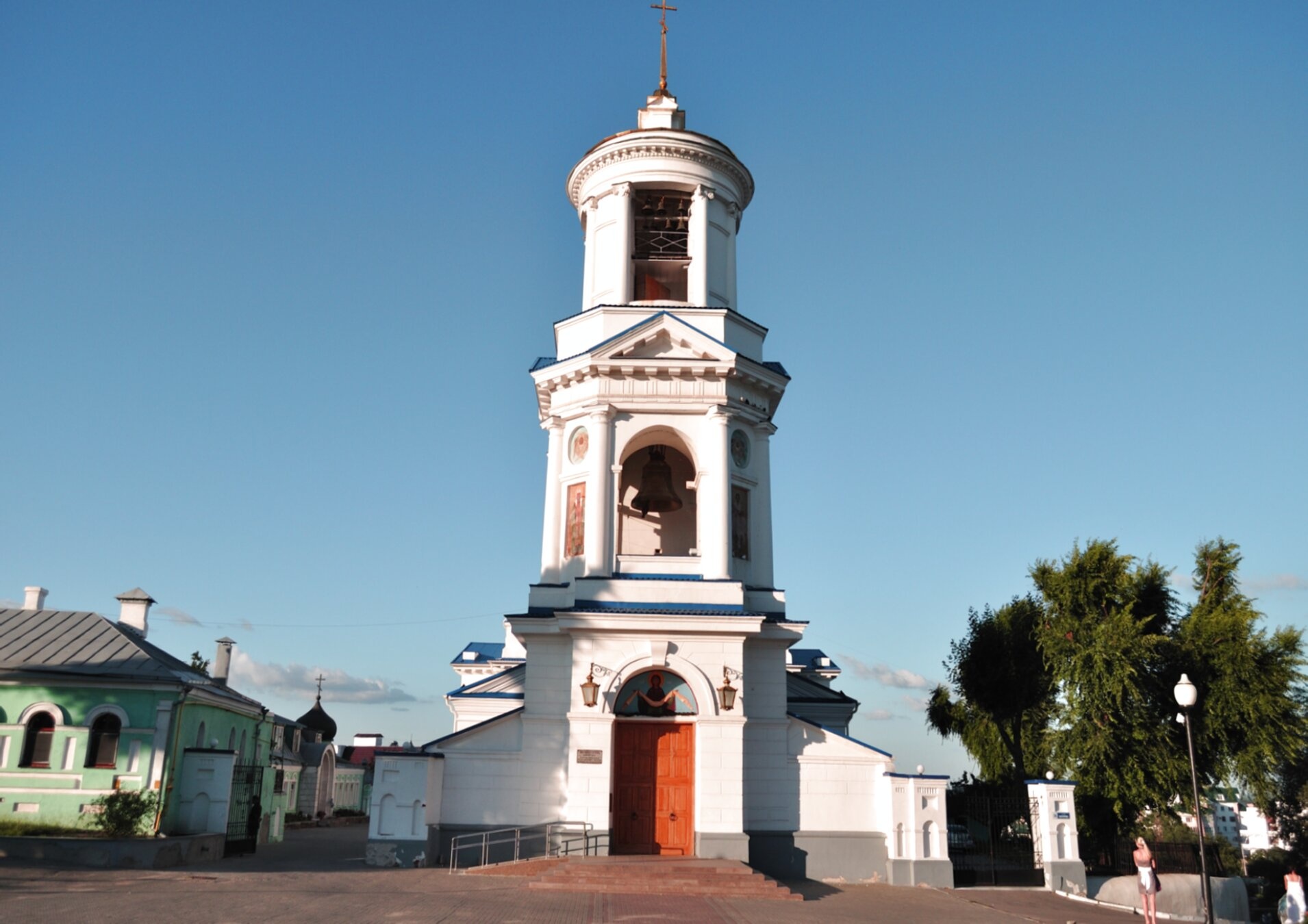 Архитектурный ансамбль собора гармоничен и устремлён ввысь. Высокая многоярусная колокольня, увенчанная золочёной главкой с крестом, является композиционным центром и хорошо видна из разных точек города. Фасад здания отличается благородной строгостью и торжественностью. На фотографии можно рассмотреть светлые стены храма, арочные оконные проёмы и изящный декор, создающий ощущение лёгкости и величия одновременно.