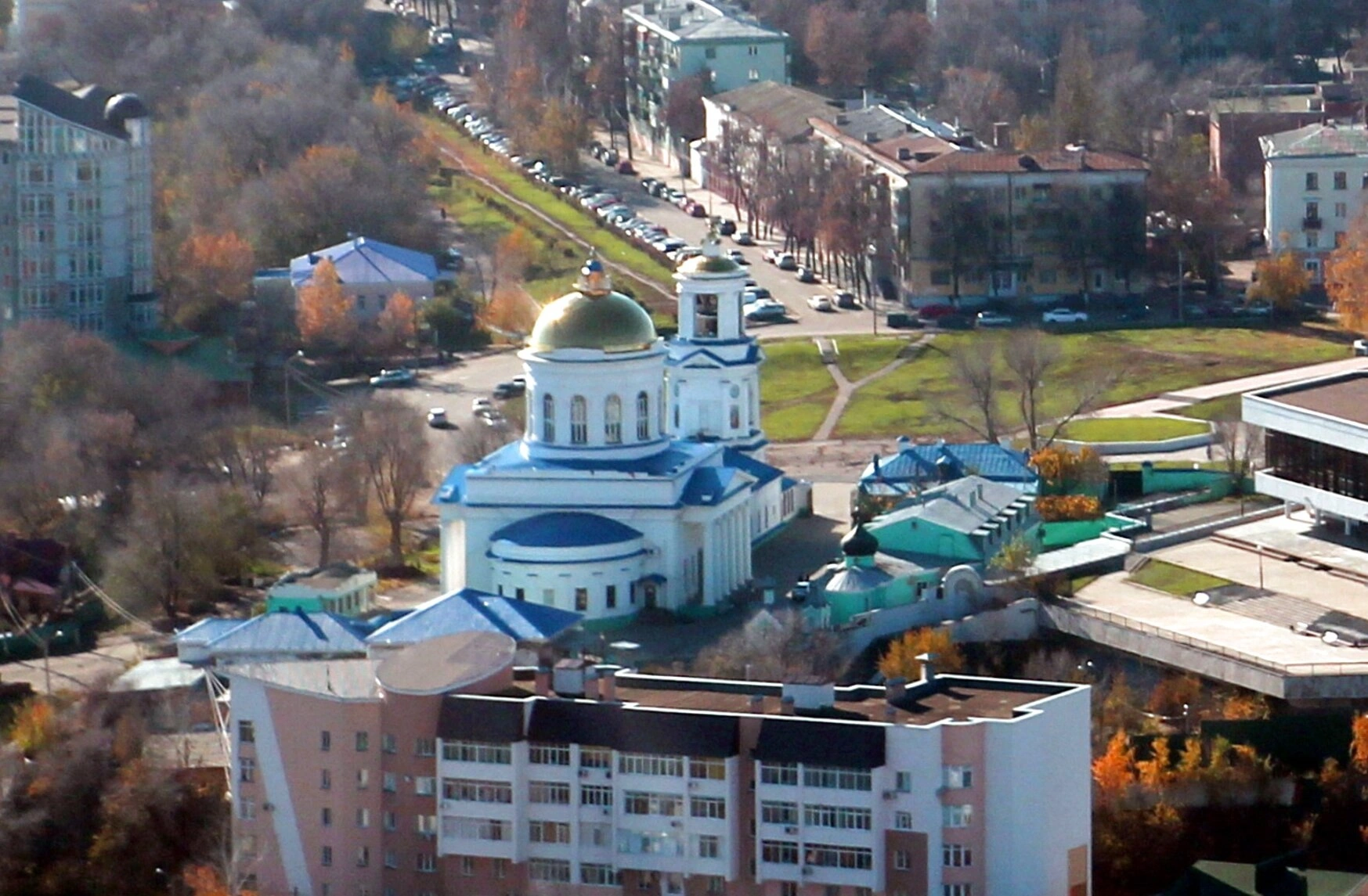 На представленной фотографии запечатлён величественный Покровский кафедральный собор, являющийся архиерейским подворьем Воронежской митрополии. Храм располагается в историческом центре города Воронежа по улице Бехтерева. Снимок выполнен с высоты, что позволяет охватить не только сам собор, но и его гармоничное вписывание в современный городской ландшафт.