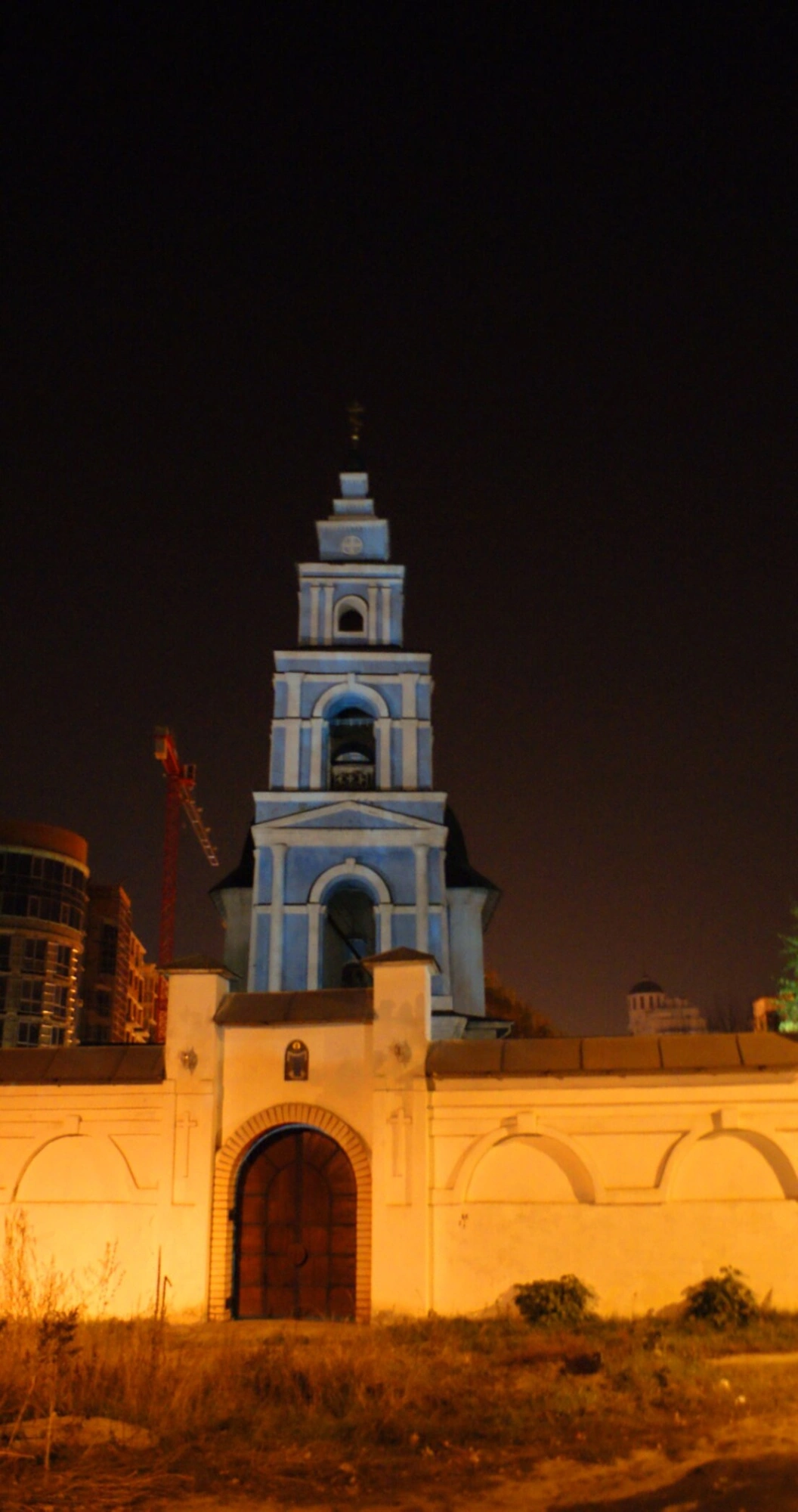 На представленной фотографии запечатлён величественный Покровский собор, являющийся главным храмом Марфо-Мариинского женского монастыря в городе Белгороде. Снимок сделан в тёмное время суток, когда искусная архитектурная подсветка эффектно выделяет белоснежные стены и златоглавые купола храма на фоне ночного неба, создавая атмосферу благоговения и духовного трепета.