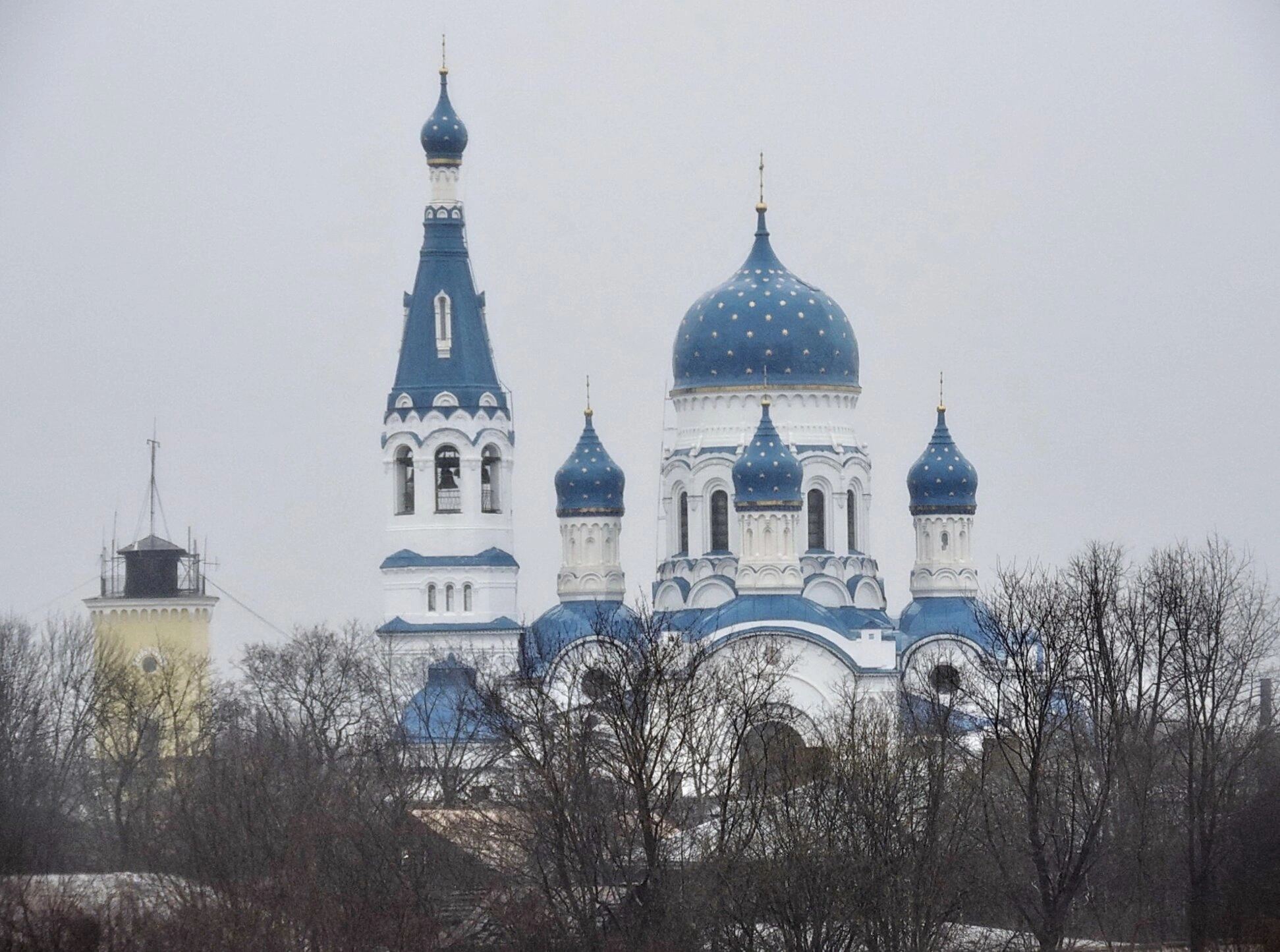 На переднем плане фотографии видны голые ветви деревьев, что свидетельствует о съемке в осенне-зимний период. Слева от собора просматривается часть другого церковного строения, создавая целостный архитектурный ансамбль. Отсутствие людей на фотографии позволяет в полной мере сосредоточиться на созерцании духовной красоты и архитектурного величия этого святого места.