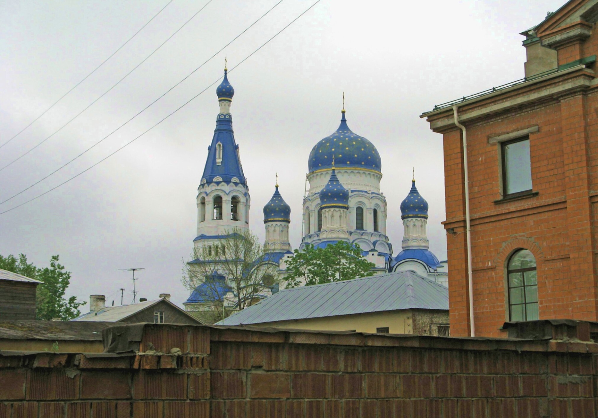 Фотография сделана в пасмурный день, что придаёт изображению особую атмосферу: яркие синие купола эффектно выделяются на фоне серого неба, подчёркивая величие православной святыни. На переднем плане виднеются элементы городской застройки — кирпичные ограждения и крыши жилых домов, что создаёт интересный контраст между мирской жизнью и духовным назначением собора.