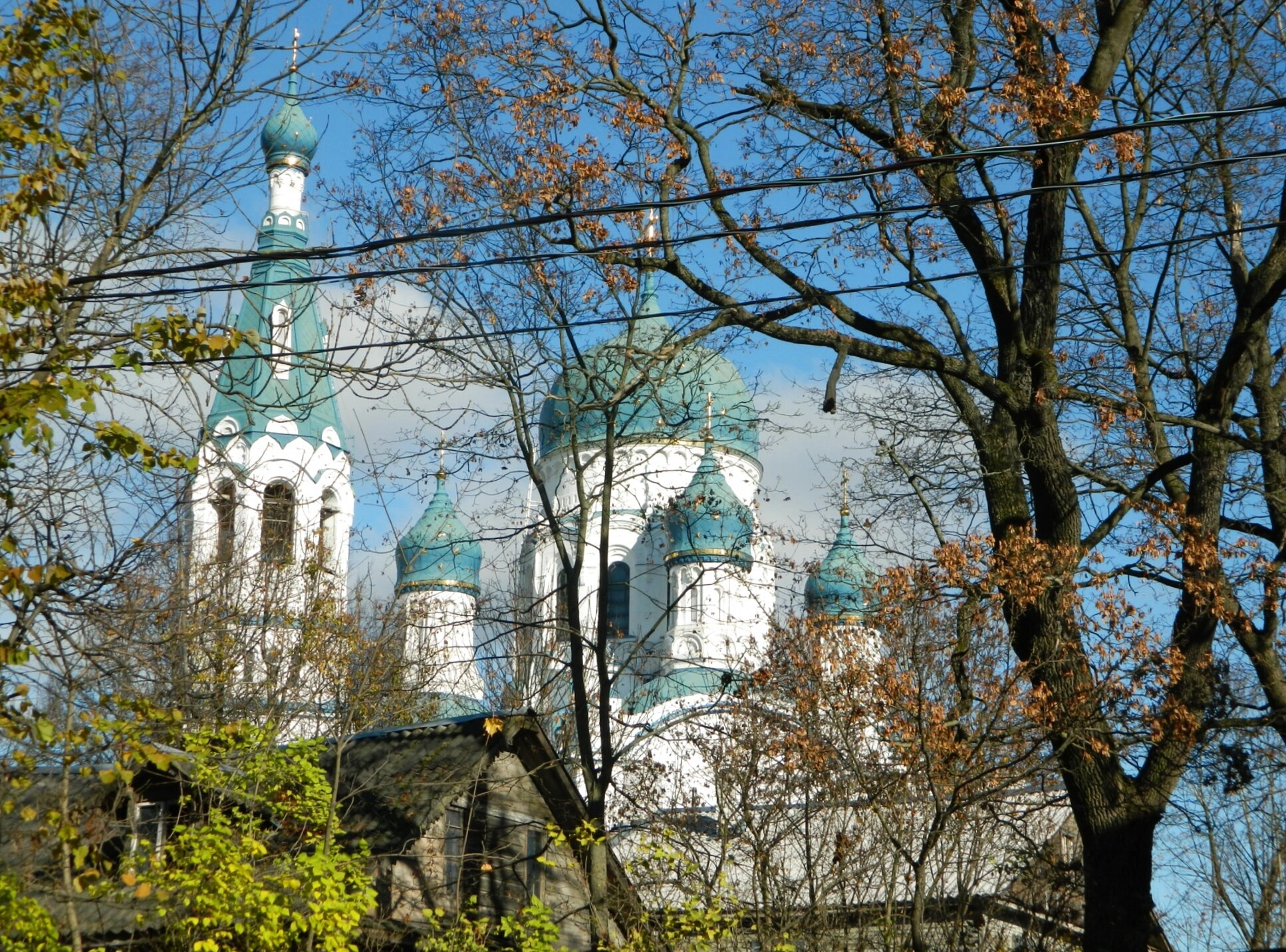 Фотография сделана в осенний период, о чём свидетельствуют деревья с пожелтевшей и опадающей листвой. Съёмка осуществлена снизу вверх сквозь ветви деревьев, что создаёт эффект присутствия и подчёркивает монументальность храмового сооружения. Такой ракурс передаёт особую атмосферу духовного величия и уединённой молитвы, характерную для православных святынь.