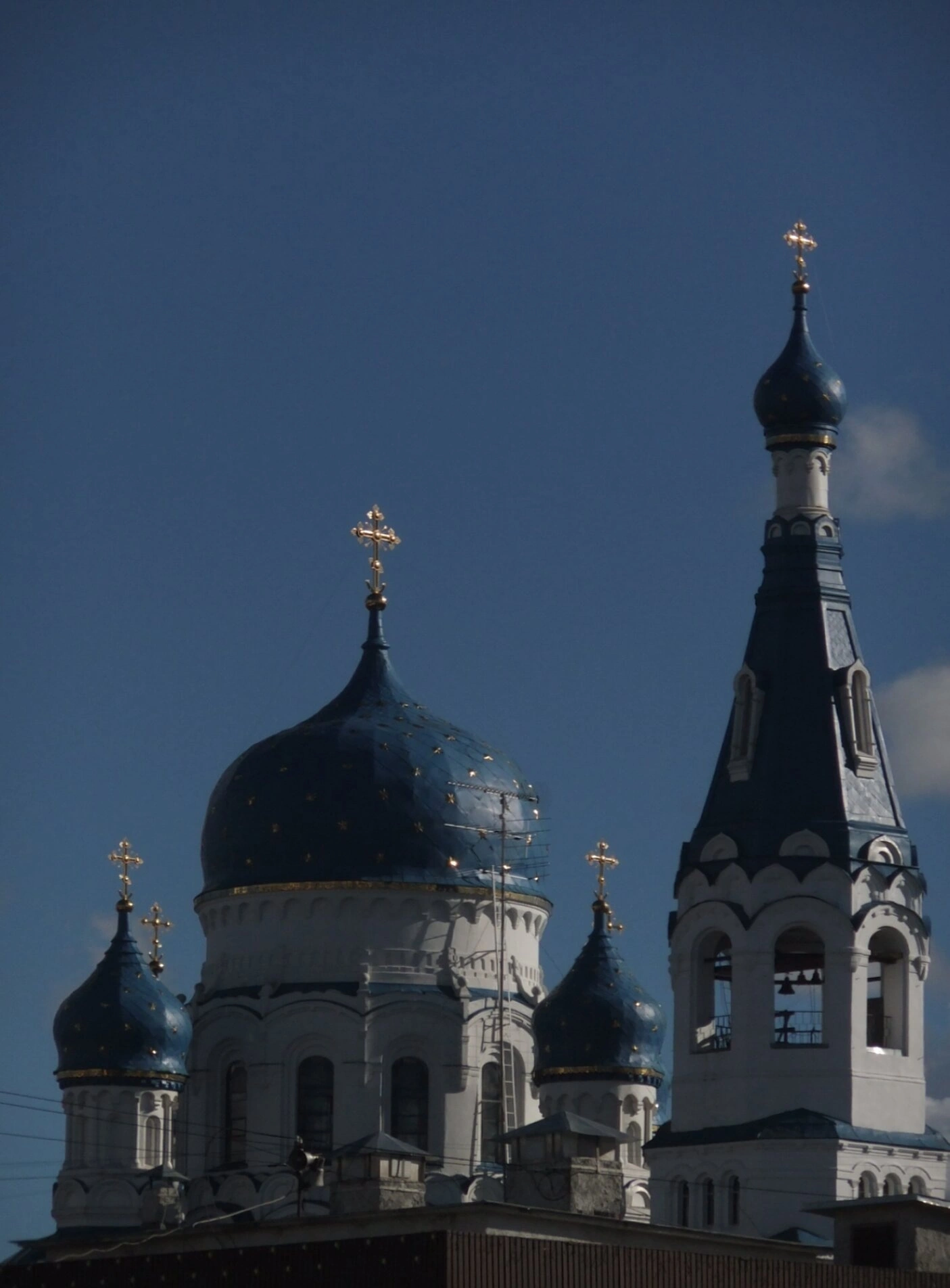 Центральным элементом композиции является монументальный главный купол, увенчанный златым крестом. Его лазурное покрытие символизирует небесную чистоту и благодать. По сторонам от главного купола расположены дополнительные главы, образующие традиционное для православного зодчества пятиглавие.