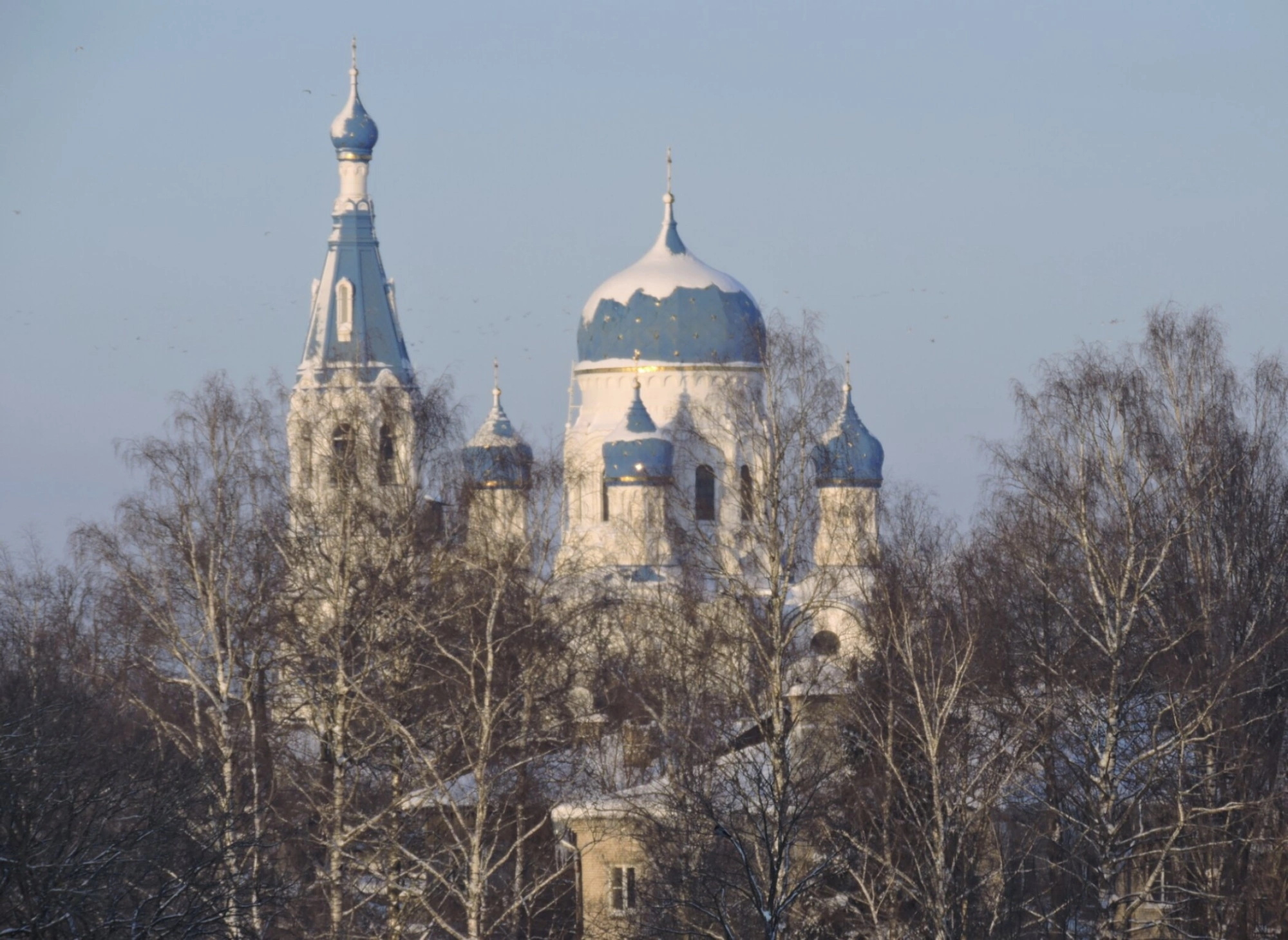 Небо на фотографии чистое, голубого оттенка, что свидетельствует о ясном морозном дне. Солнечный свет мягко освещает храм, подчёркивая архитектурные детали и создавая благодатную атмосферу. Отсутствие людей на снимке позволяет сосредоточить внимание на духовной составляющей и архитектурной красоте православной святыни в её зимнем убранстве.