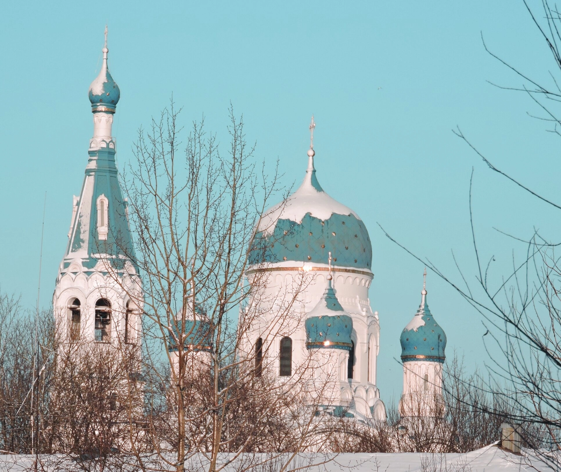 Белоснежные стены храма гармонично сочетаются с синими куполами, увенчанными золочеными крестами. Четыре главки, выполненные в традиционной луковичной форме, покрыты изящным орнаментом и тонким слоем снега, что придает сооружению особое очарование. Архитектурный облик собора отражает лучшие традиции русского церковного зодчества.