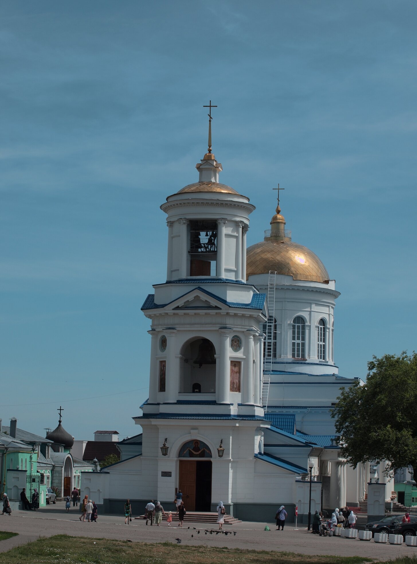 Архитектурный облик собора, представленный на снимке, воплощает лучшие традиции русского церковного зодчества. Белоснежные стены храма символизируют чистоту и святость, а синие кровли и сияющие золотом купола, увенчанные крестами, устремляются к небесам. Центральный золочёный купол, олицетворяющий Господа Иисуса Христа, окружён четырьмя меньшими главами. Высокая многоярусная колокольня с арочными проёмами и часами завершается золочёным шатром, придавая всему ансамблю гармоничную завершённость.