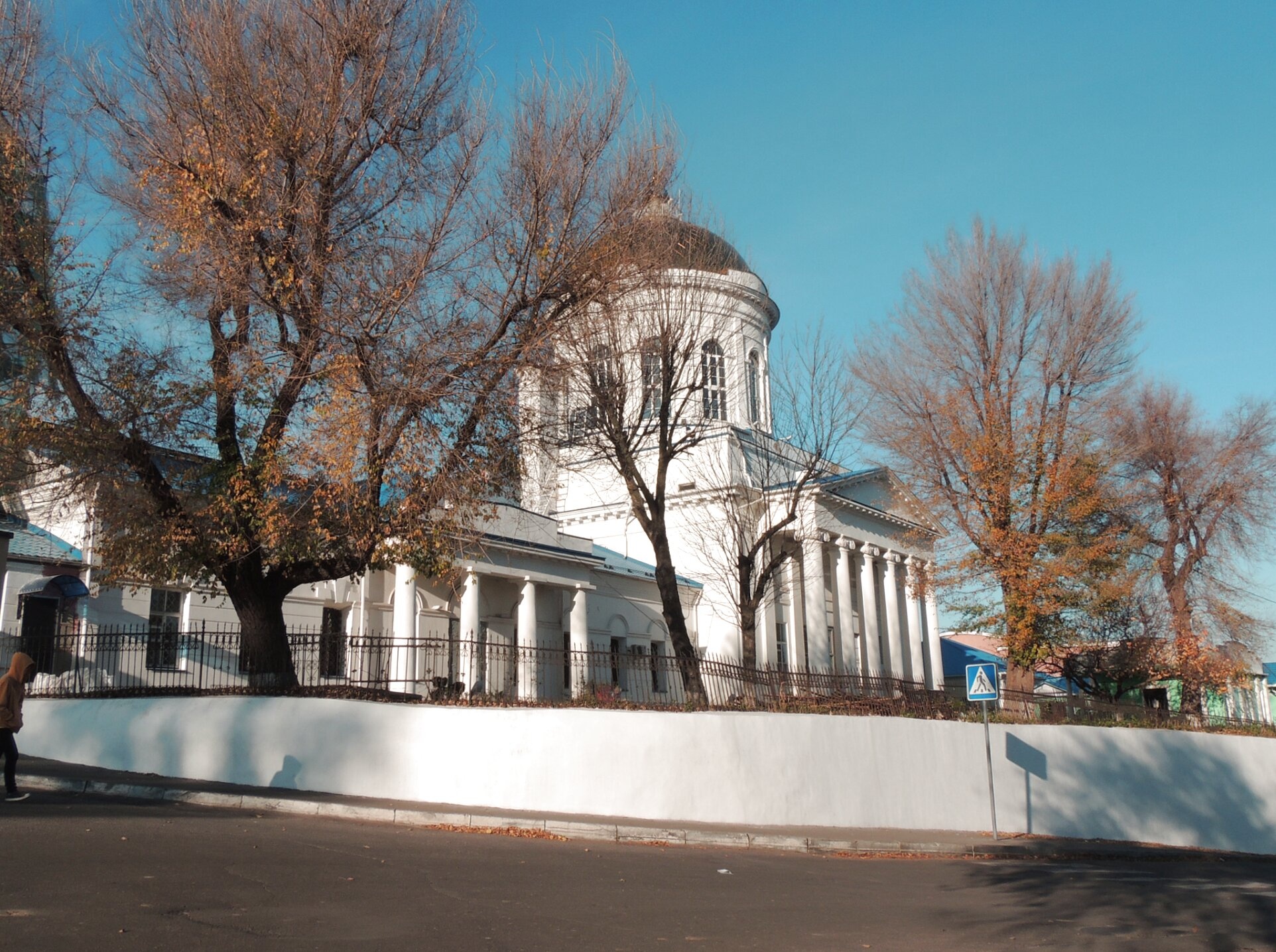 Белоснежные стены храма, украшенные классическими колоннами, эффектно выделяются на фоне глубокой лазури безоблачного неба. Золотой купол, венчающий собор, сияет в лучах осеннего солнца, символизируя небесную славу. Территорию вокруг дома Божия окружает ухоженная ограда, а на переднем плане виден благоустроенный тротуар, где запечатлен прихожанин, направляющийся к святыне.