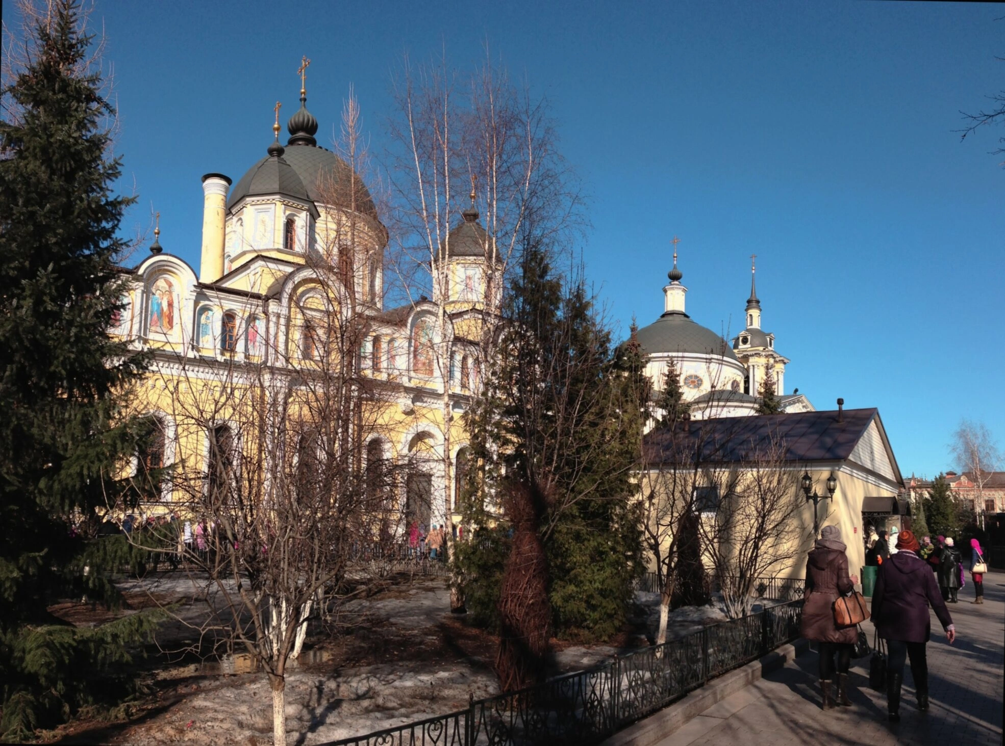 Территория обители ухожена и благоустроена. Вокруг храмовых построек видны деревья, чьи ветви, лишённые листвы, и участки снега на земле указывают на позднюю осень или раннюю весну — время особого молитвенного сосредоточения. Прихожане и паломники, изображённые на переднем плане, неспешно прогуливаются по монастырским дорожкам, устремляясь к святыням этого благодатного места.