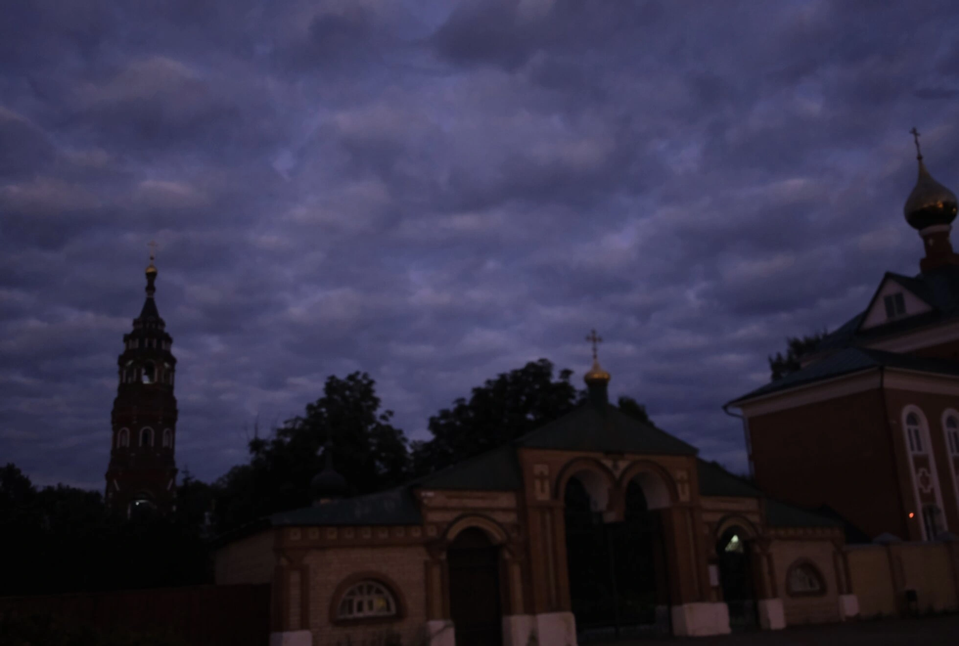 На представленной фотографии запечатлён архитектурный ансамбль Покровско-Васильевского мужского монастыря, расположенного в городе Павловский Посад Московской области. Снимок сделан в тёмное время суток, когда искусственное освещение мягко выделяет святые врата, храмовые здания и высокую колокольню, создавая молитвенную и сосредоточенную атмосферу. Небо, покрытое облаками, и тёмные силуэты деревьев подчёркивают благоговейную тишину, окружающую обитель.