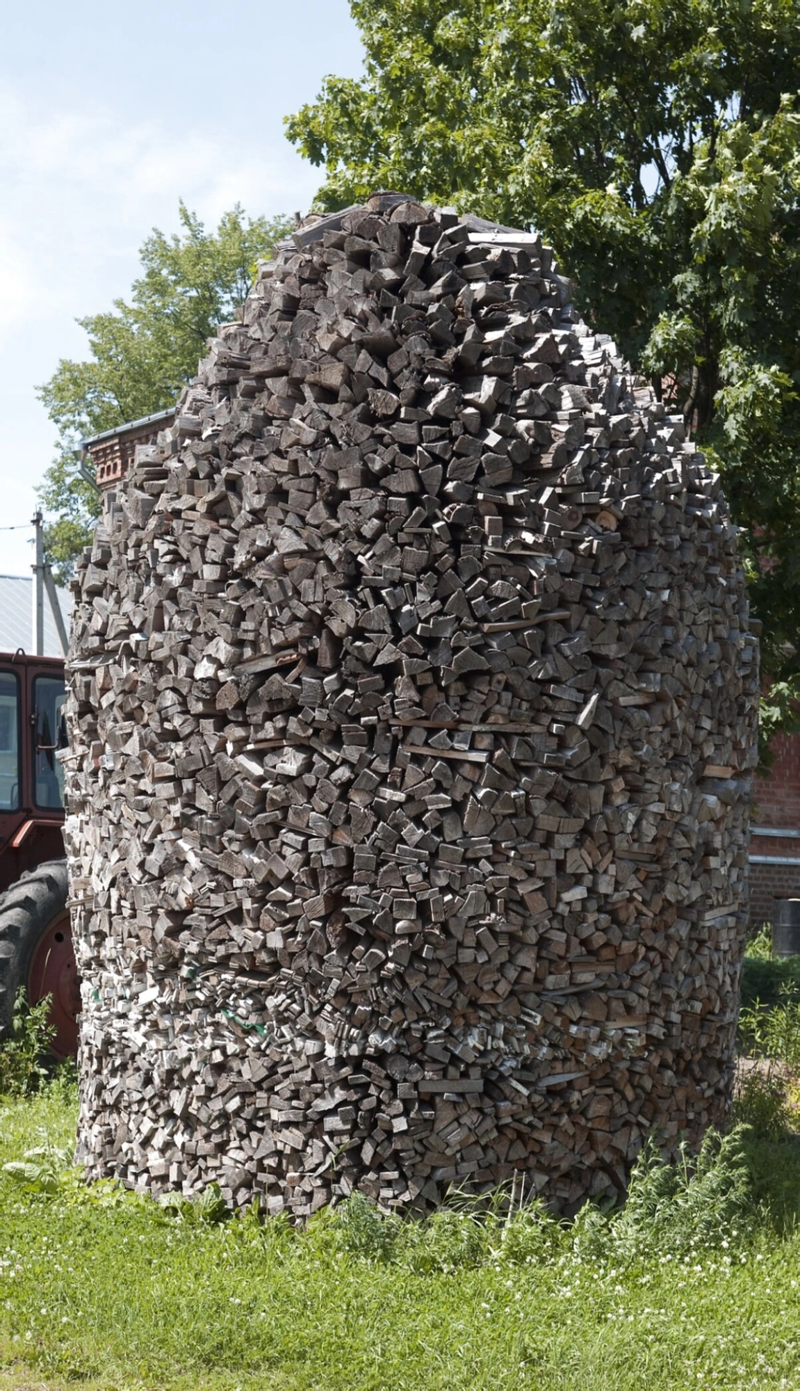 На представленной фотографии запечатлена одна из деталей повседневной хозяйственной жизни ставропигиального женского монастыря в честь Покрова Пресвятой Богородицы в городе Хотьково. На снимке изображена большая, аккуратно сложенная поленница колотых дров конической формы, что свидетельствует о добротном ведении монастырского хозяйства и попечении сестёр о подготовке к зимнему отопительному сезону.
