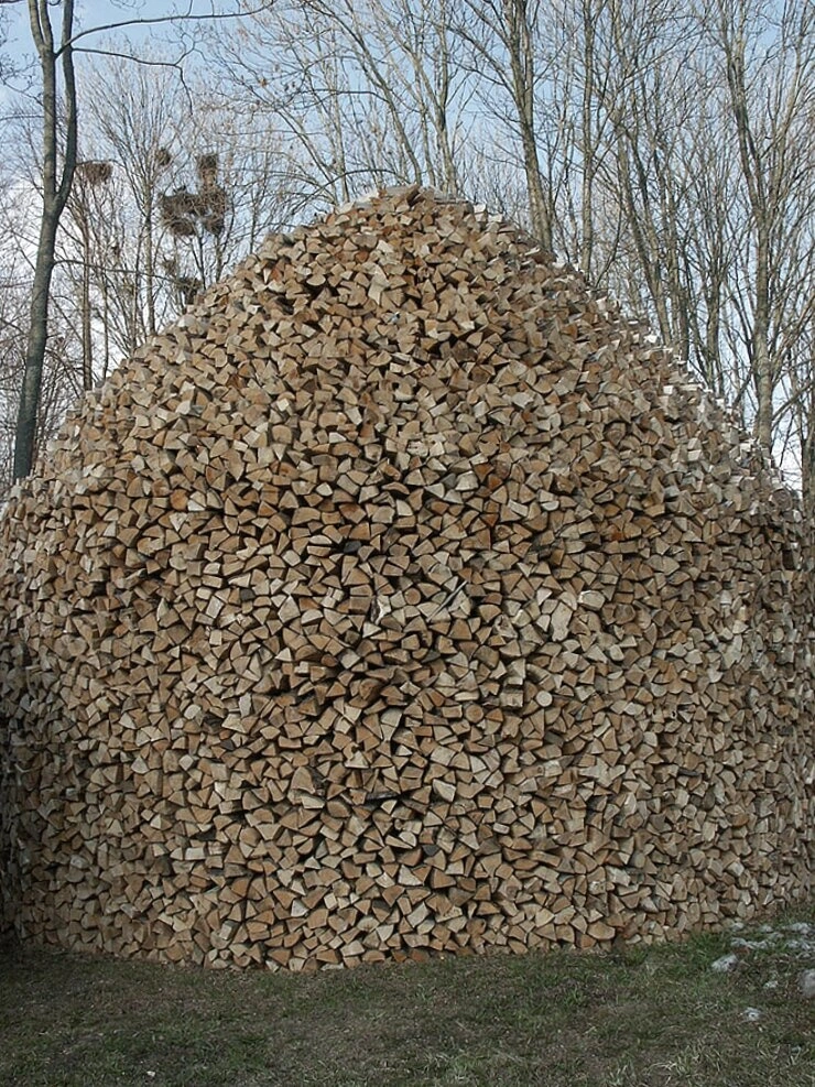 На представленной фотографии запечатлена большая, искусно сложенная поленница дров, находящаяся на территории Варлаамо-Хутынского Спасо-Преображенского женского монастыря, что в деревне Хутынь Новгородской области. Поленья аккуратно уложены в форме купола, что свидетельствует о многовековой традиции монастырского хозяйствования и особом отношении к порядку и благоустроению святой обители.