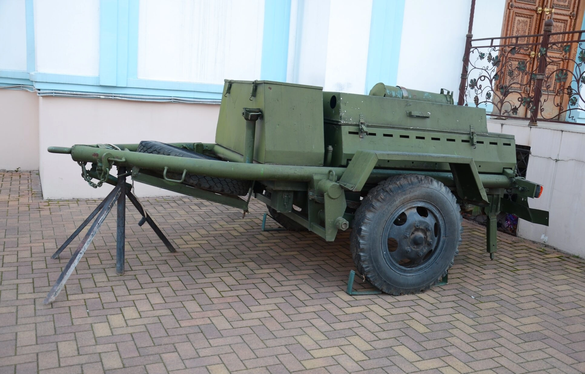 На представленной фотографии запечатлена полевая кухня КП-130, временно размещённая на территории собора в честь Покрова Пресвятой Богородицы, что в городе Краснодаре. Данный образец является современной мобильной кухней, предназначенной для полноценного обеспечения горячим питанием личного состава в полевых условиях. Она способна одновременно приготовлять пищу на большую группу людей численностью до ста тридцати человек.
